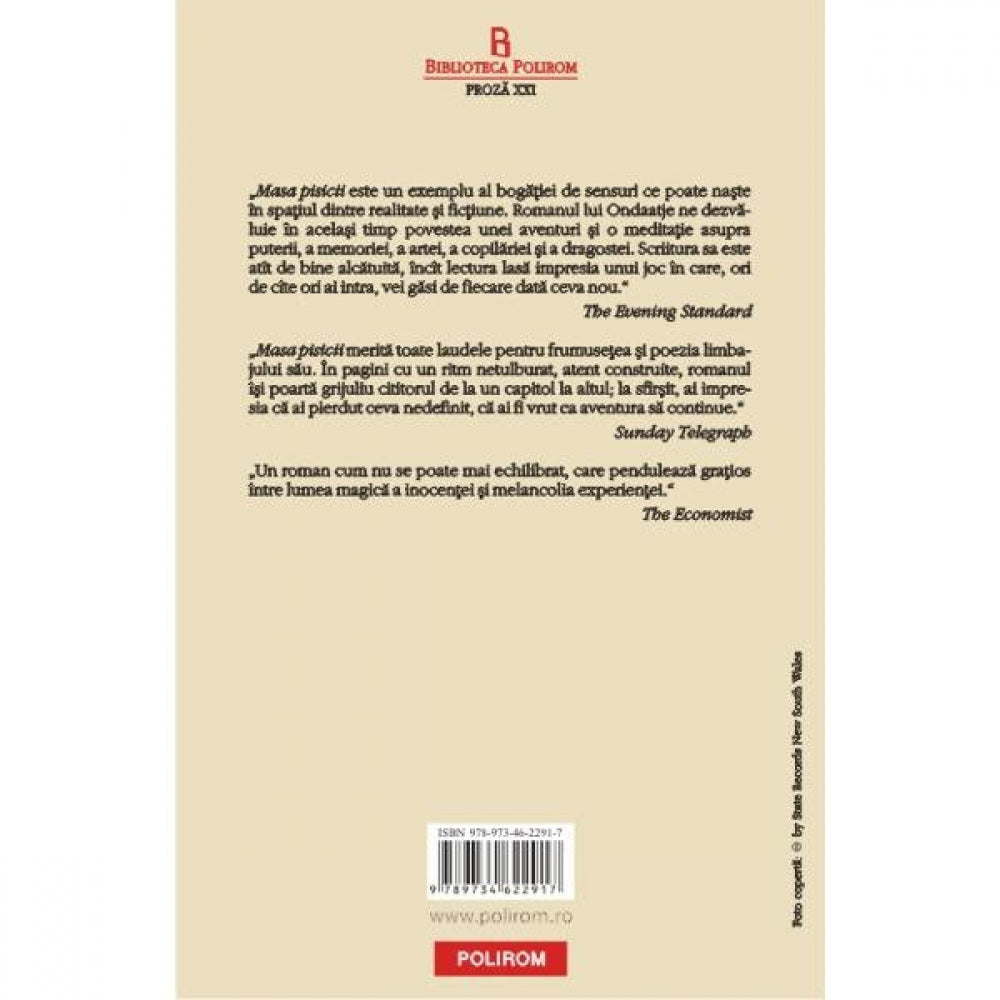 Masa pisicii (2011) e povestea calatoriei a trei baieti cu un pachebot, din Sri Lanka pina in Anglia, prin Marea Indiei, Canalul Suez si Marea Mediterana. Cei trei baieti, Michael (povestitorul), Cassius si Ramadhin, calatoresc fara parinti si sint lasati fiecare in grija unor rude sau cunoscuti; asa ajung sa se lase prada imaginatiei si sa se tina de tot felul de nazbitii, unele cu sfirsit dramatic. Povestea lumii plutitoare ce populeaza pachebotul Oronsay si a celor trei baieti este un triumf al fanteziei, al lumii ce se poate naste in golul dintre realitate si fictiune.