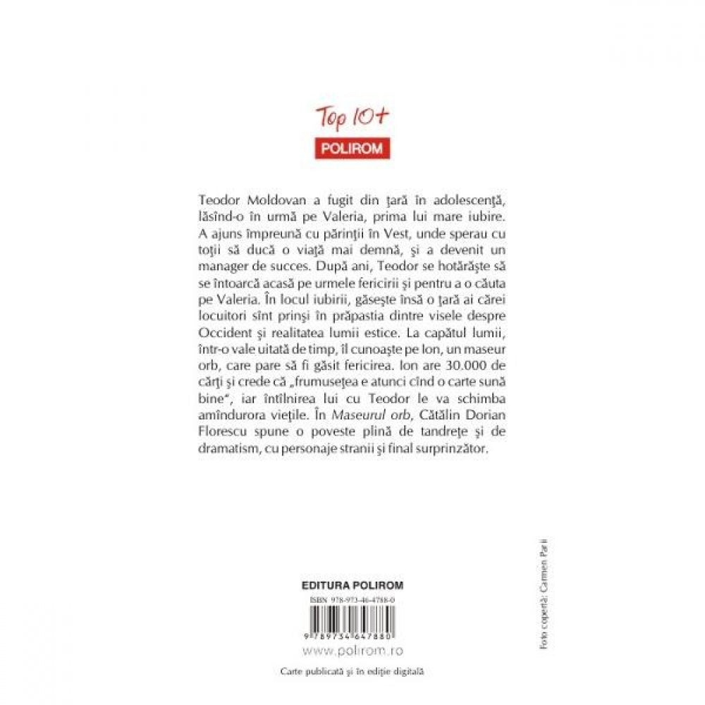A ajuns impreuna cu parintii in Vest, unde sperau cu totii sa duca o viata mai demna, si a devenit un manager de succes. Dupa ani, Teodor se hotaraste sa se intoarca acasa pe urmele fericirii si pentru a o cauta pe Valeria. In locul iubirii, gaseste insa o tara ai carei locuitori sint prinsi in prapastia dintre visele despre Occident si realitatea lumii estice. La capatul lumii, intr-o vale uitata de timp, il cunoaste pe Ion, un maseur orb, care pare sa fi gasit fericirea. Ion are 30.000 de carti si crede ca „frumusetea e atunci cind o carte suna bine”, iar intilnirea lui cu Teodor le va schimba amindurora vietile. In Maseurul orb, Catalin Dorian Florescu spune o poveste plina de tandrete si de dramatism, cu personaje stranii si final surprinzator.