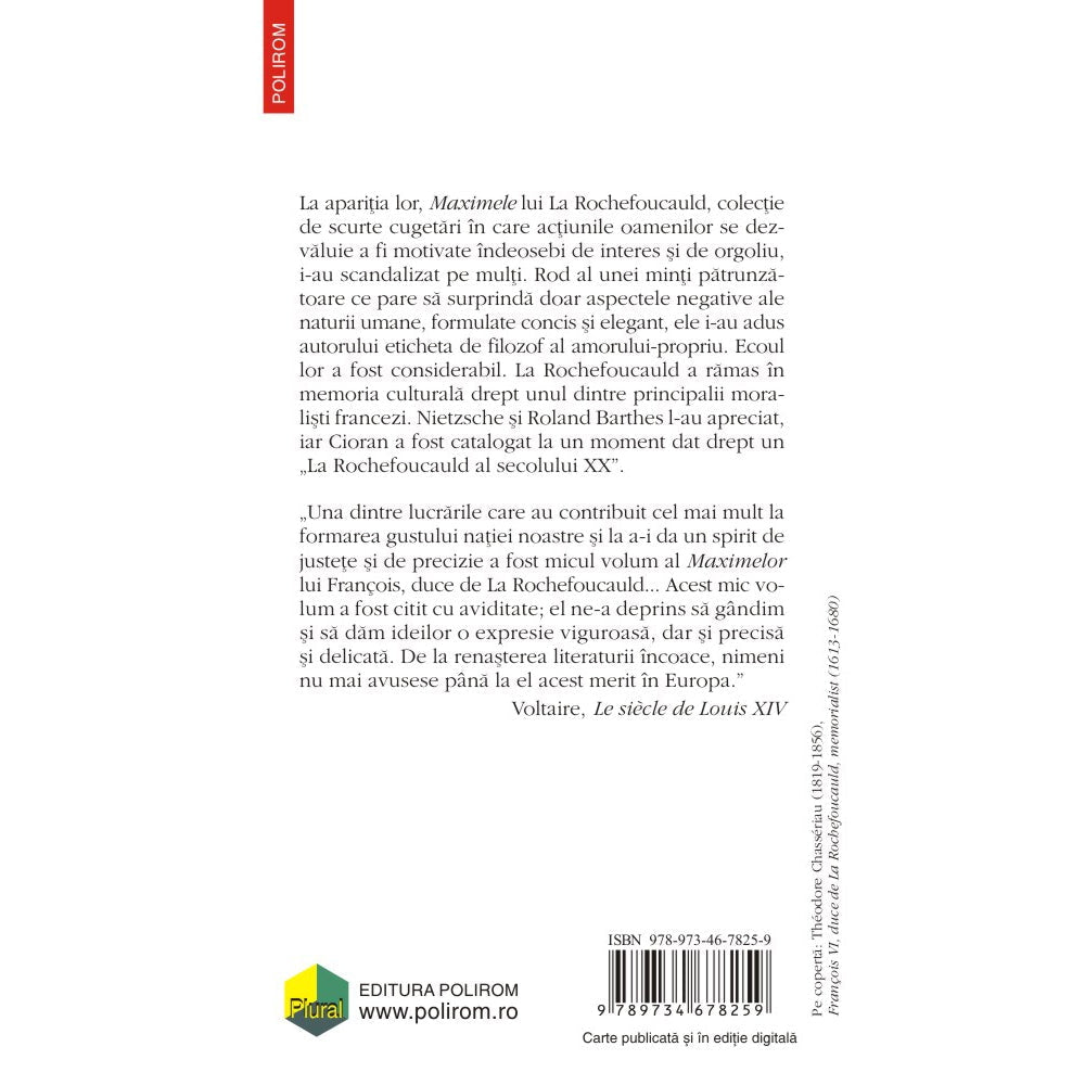 „Una dintre lucrarile care au contribuit cel mai mult la formarea gustului natiei noastre si la a-i da un spirit de justete si de precizie a fost micul volum al Maximelor lui François, duce de La Rochefoucauld... Acest mic volum a fost citit cu aviditate; el ne-a deprins sa gindim si sa dam ideilor o expresie viguroasa, dar si precisa si delicata. De la renasterea literaturii incoace, nimeni nu mai avusese pina la el acest merit in Europa.” (Voltaire, Le siècle de Louis XIV)