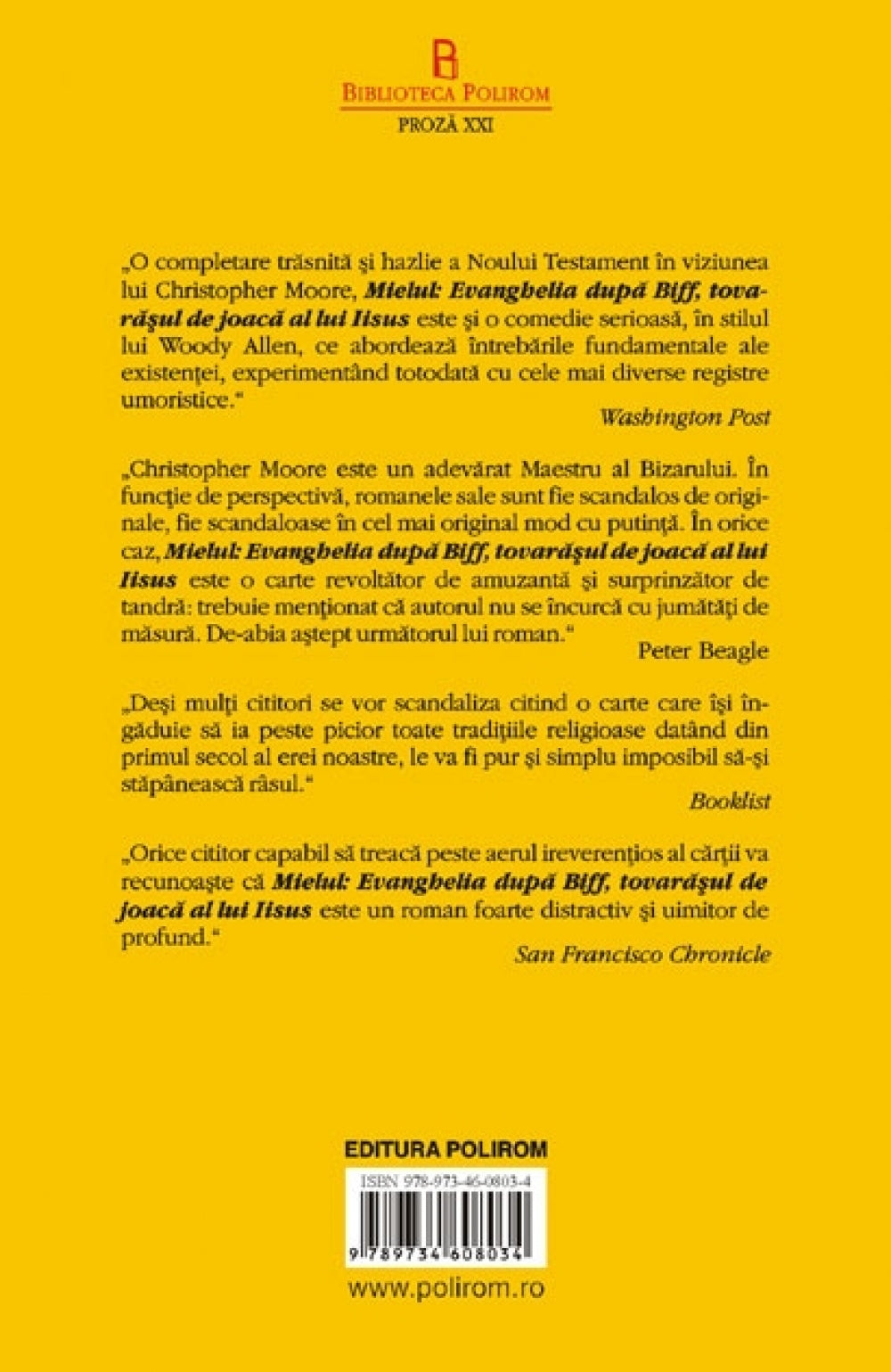 Mielul: Evanghelia dupa Biff, tovarasul de joaca al lui Iisus este o privire absolut ireverentioasa, dar tandra si plina de umor, aruncata in culisele istoriei sacre. Nasterea lui Iisus a fost consemnata in Evanghelii, ca si invataturile, faptele si sacrificiul sau divin. Insa nimeni nu stie nimic despre copilaria Fiului Domnului – nimeni in afara de prietenul sau, Biff. Inca din ziua in care Levi, fiul lui Alfeu, poreclit Biff, l-a intilnit pe Iosua din Nazaret, pe atunci in virsta de sase ani, surprinzindu-l pe cind invia o sopirla, cei doi au devenit nedespartiti. De aceea, ingerul Raziel l-a readus pe Biff la viata si l-a incuiat intr-o camera de hotel din Statele Unite ale Americii pentru a scrie o noua Evanghelie, povestea nestiuta de nimeni altcineva. Intre timp, Raziel comanda pizza, se uita la seriale siropoase si aspira sa devina Omul Paianjen. Si, la rindul ei, istoria lui Biff e intesata de minuni, calatorii cu totul neobisnuite, vindecari si invieri miraculoase, kung fu, demoni si tipe tari. Pericolul pindeste la tot pasul, caci, incapabil sa minta sau sa comita vreun act de violenta, Iosua isi face o multime de dusmani. Din fericire, Biff este un maestru al inselaciunii, petrecaret si cu limba ascutita, gata sa-si puna talentele in slujba amicului sau.