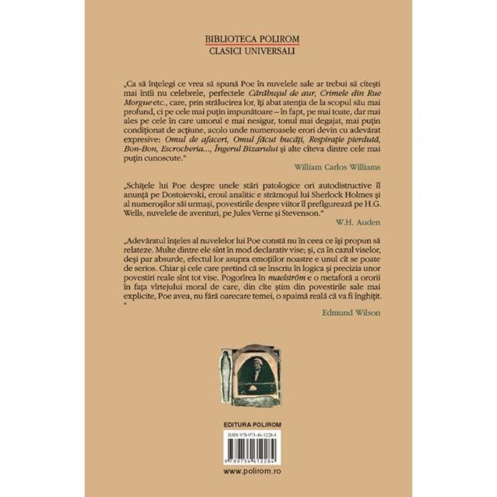 Volumul de fata, impreuna cuMasca Mortii Rosii(Polirom, 2003), ofera publicului cititor un tablou complet al nuvelisticii autorului american – gen literar care i-a consolidat reputatia atit in Statele Unite, cit si peste hotare. Volumul cuprinde, in versiuni noi, moderne, celebreleCarabusul de aur,Butoiul de Amontillado,Pisica neagra,Ingropat de viu,Scrisoarea furataetc., alaturi de numeroase(peste jumatate din cuprinsul volumului) nuvele si povestiri inedite. Pe linga citeva din capodoperele gotice ale autorului, sint incluse cele doua nuvele politiste ale lui Poe, avindu-l ca protagonist pe celebrul detectiv Auguste C. Dupin, precum si povestiri umoristico-parodice mai putin cunoscute(Viata literara a domnului Bob Cutarica, Sistemul doctorului Catran si al profesorului Panasi altele). Totodata, el pune la dispozitia cititorilor un amplu si util instrumentar critic: un capitol de note si comentarii menite sa faciliteze intelegerea numeroaselor aluzii si referinte istorice si culturale.