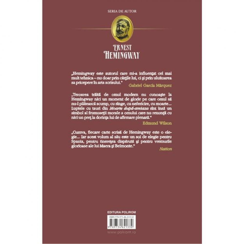 Moarte dupa-amiaza este considerata si azi cea mai buna carte despre corida. Dar ea nu este un banal tratat despre luptele cu tauri. Scrisa cu pasiune de un mare prozator si un mare aficionado al acestui spectacol tragic, ea este si o meditatie profunda asupra vietii.