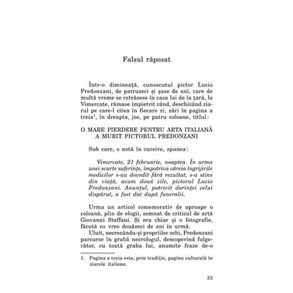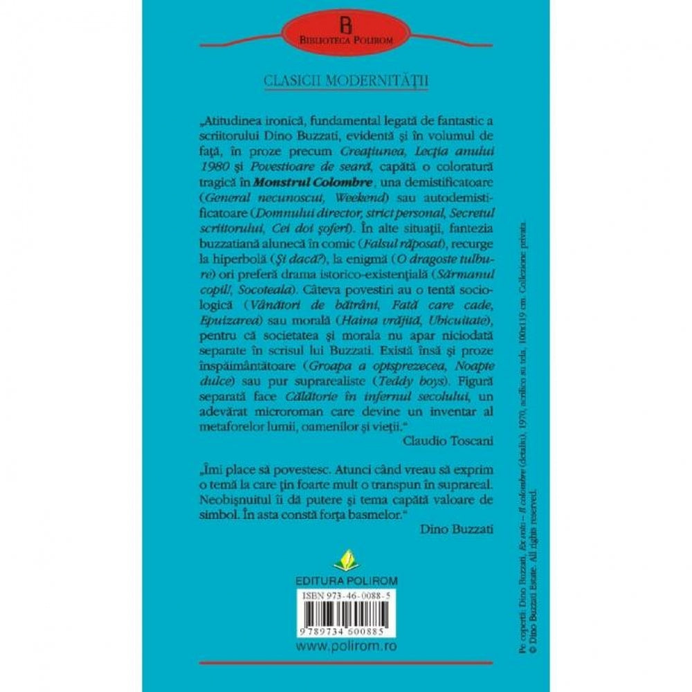 „Atitudinea ironica, fundamental legata de fantastic in proza lui Dino Buzzati, evidenta si in acest volum, in povestiri precum(Creatia,Lectia anului 1980,Povestioare de seara), capata o coloratura tragica in povestirea care da titlul volumului, una demistificatore(General necunoscut,Weekend) sau autodemistificatoare in(Domnului director, strict personal,Secretul scriitorului,Cei doi soferi). In alte situatii, fantezia buzzatiana aluneca in comic(Falsul raposat), recurge la hiperbola(Si daca?) sau la enigma(O dragoste tulbure) ori prefera drama istorico-existentiala(Sarmanul copil!,Socoteala). Alte povestiri au o tenta sociologica(Vinatori de batrini,Fata care cade,Epuizare) sau morala(Haina vrajita,Ubicuul), pentru ca societatea si morala nu apar niciodata separate in scrisul lui Buzzati. Exista insa si proze inspaimintatoare(Groapa a optsprezecea,Noapte dulce) sau pur suprarealiste(Teddy Boys). Figura separata faceCalatorie in infernul secolului, care poate fi considerata un microroman si care devine un inventar al metaforelor lumii, oamenilor si vietii.”(Claudio Toscani)