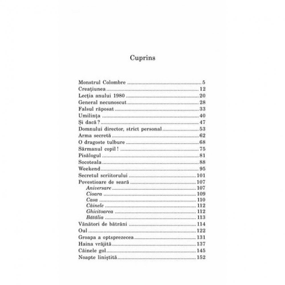 Cuprins:Monstrul Colombre • Umilinta • Arma secreta • O dragoste tulbure • Pisalogul • Aniversare • Cioara • Sinucidere in parc • Prabusirea Sfintului • Turnul Eiffel • Cutia de tinichea • Altarul • Cocoasele din gradina •Quizla puscarie • Iago.