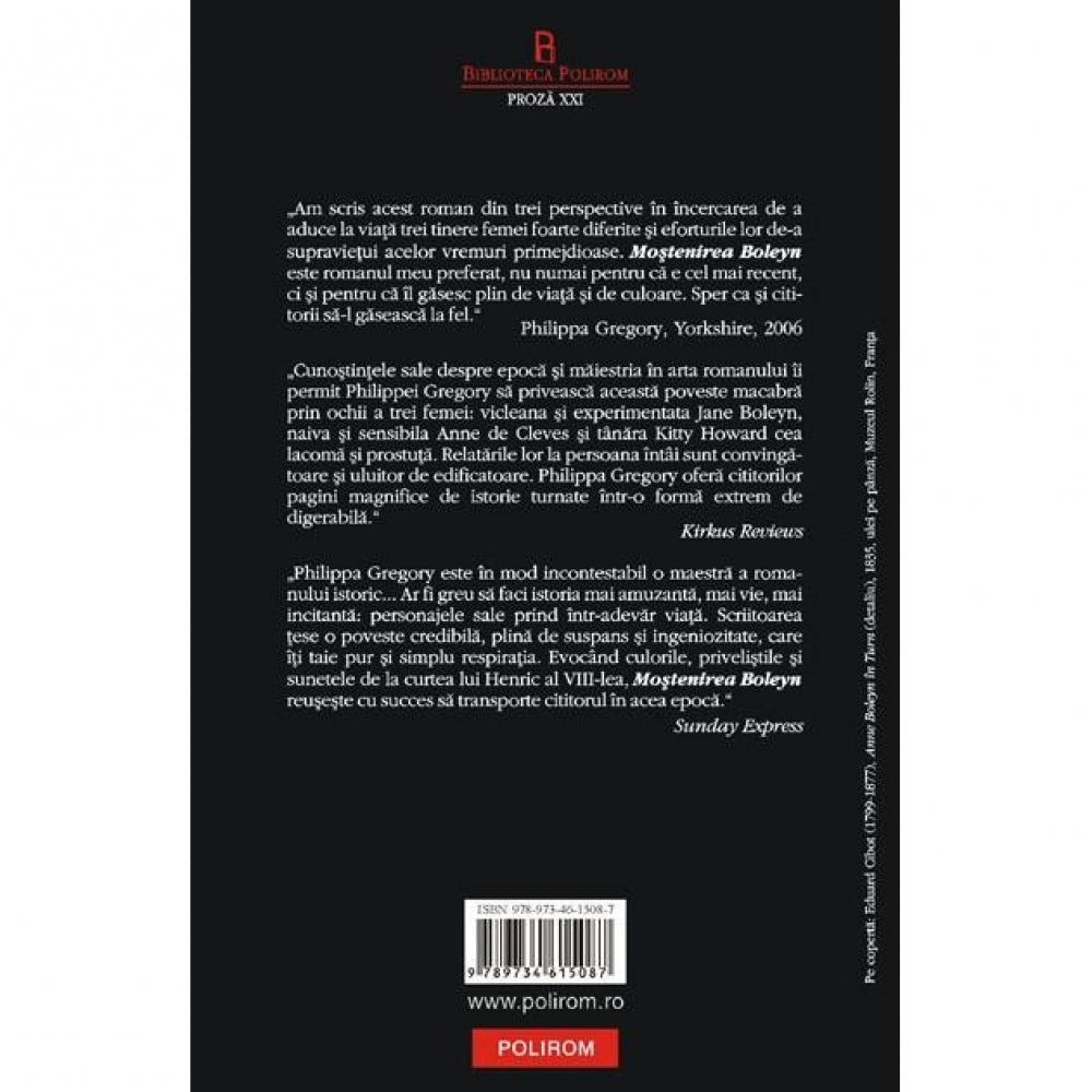 Inscriindu‑se in ciclul romanelor care au drept subiect epoca dinastiei Tudor, Mostenirea Boleyn (2006) evoca admirabil atmosfera de teroare si nesiguranta ce domneste la curtea Angliei in ultimii ani de cirmuire ai regelui Henric al VIII‑lea, vazuta din perspectiva a trei femei extrem de diferite, ale caror destine sint legate intre ele prin mostenirea cumplita lasata in urma de Anne Boleyn: regina Anne de Cleves, Katherine Howard, domnisoara ei de companie si apoi succesoarea ei la tronul Angliei, si Jane Boleyn, femeia care si‑a trimis sotul si cumnata la esafod prin marturia ei mincinoasa si care devine unealta distrugerii acestor doua regine efemere. Philippa Gregory incearca sa restabileasca adevarul istoric si sa ofere cititorului un portret cit mai apropiat de realitate al acestor trei femei nedreptatite vreme indelungata de sursele istorice, sur­prinzind cu o subtilitate uimitoare gindurile, temerile, ambitiile si eforturile lor de‑a supravietui intr‑o lume primejdioasa, sfisiata de intrigi complicate si condusa de un rege tiranic, suspicios si razbunator, care dispune dupa bunul sau plac de vietile supusilor si se crede egalul lui Dumnezeu. Alternind cu maiestrie perspectivele narative si mizind pe naratiunea la persoana intii, Philippa Gregory creeaza personaje credibile, oferind cititorului o perspectiva inedita si incitanta asupra evenimentelor istorice.