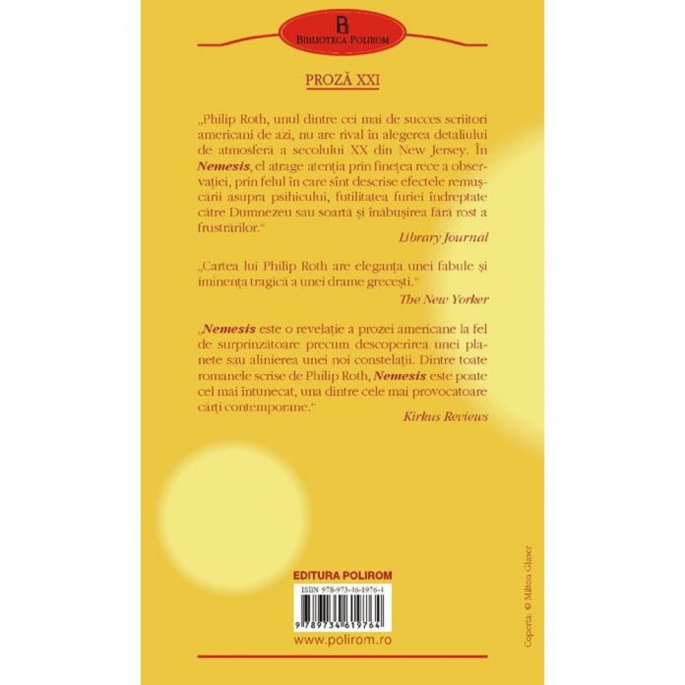 „Philip Roth, unul dintre cei mai de succes scriitori americani de azi, nu are rival in alegerea detaliului de atmosfera a secolului XX din New Jersey. In Nemesis, el atrage atentia prin finetea rece a observatiei, prin felul in care sint descrise efectele remuscarii asupra psihicului, futilitatea furiei indreptate catre Dumnezeu sau soarta si inabusirea fara rost a frustrarilor.”(Library Journal)