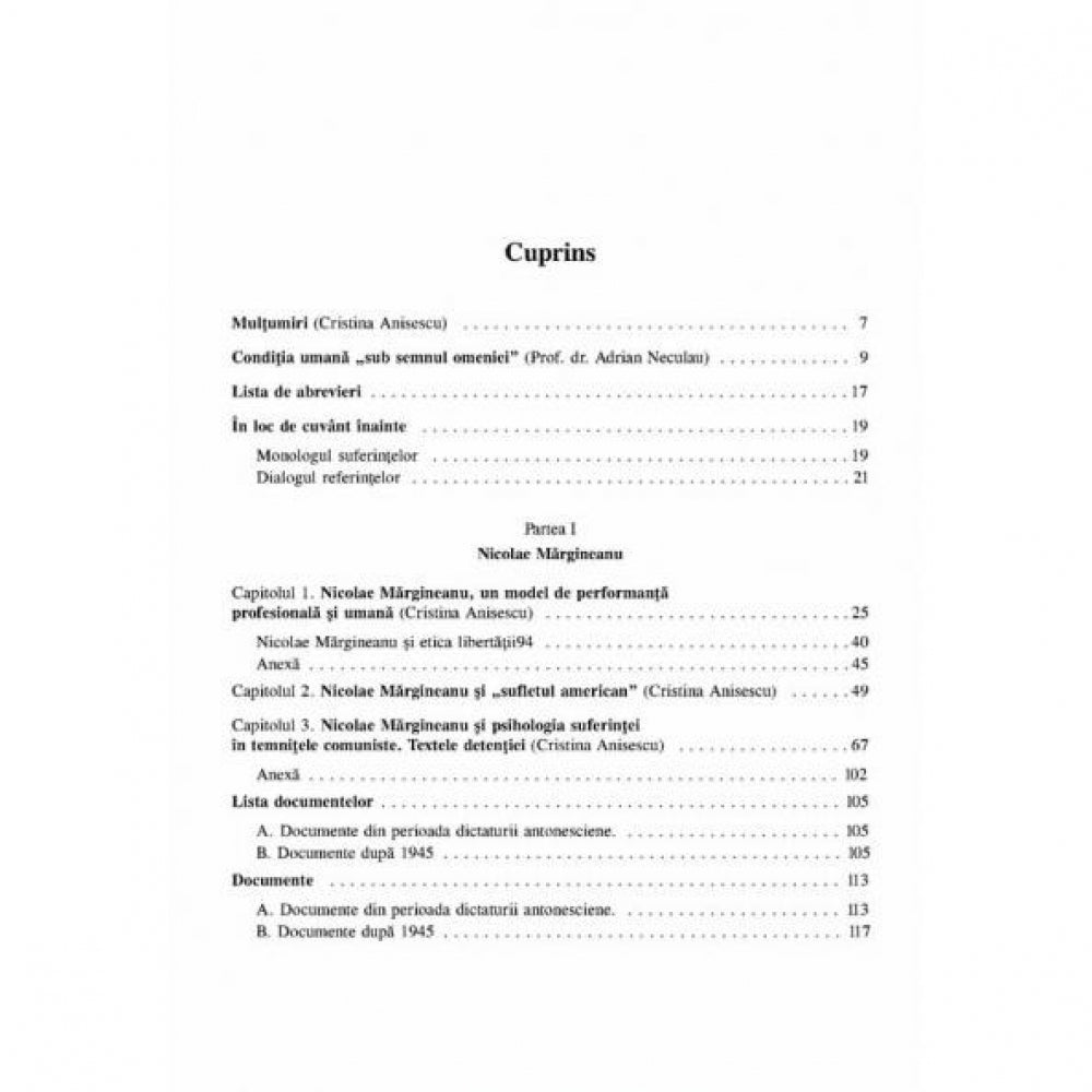 Cuprins:Nicolae Margineanu, un model de performanta profesionala si umana * Nicolae Margineanu si psihologia suferintei in temnitele comuniste. Textele detentiei * Din documentele rezistentei anticomuniste. Petru si Eugen Margineanu * Al doilea cerc al suferintei. Familia profesorului Margineanu: metamorfozele supravietuirii * Documente-facsimil si fotografii