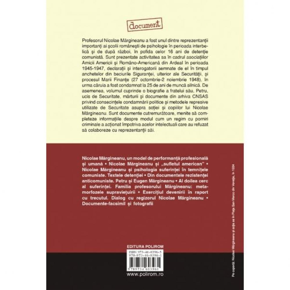 Profesorul Nicolae Margineanu a fost unul dintre reprezentantii importanti ai scolii romanesti de psihologie in perioada interbelica si de dupa razboi, in pofida celor 16 ani de detentie comunista. Sint prezentate activitatea sa in cadrul asociatiilor Amicii Americii si Romano-Americana din Ardeal in perioada 1945-1947, declaratii si interogatorii semnate de el in timpul anchetelor din beciurile Sigurantei, ulterior ale Securitatii, si procesul Marii Finante(27 octombrie-2 noiembrie 1948), in urma caruia a fost condamnat la 25 de ani de munca silnica. De asemenea, volumul cuprinde o biografie a fratelui sau, Petru, ucis de Securitate, marturii si documente din arhiva CNSAS privind consecintele condamnarii politice si metodele represive utilizate de Securitate asupra sotiei si copiilor lui Nicolae Margineanu. Sint documente cutremuratoare, menite sa completeze informatiile despre modul cum un regim cu porniri criminale a actionat impotriva acelor intelectuali care au refuzat sa colaboreze cu reprezentantii sai.