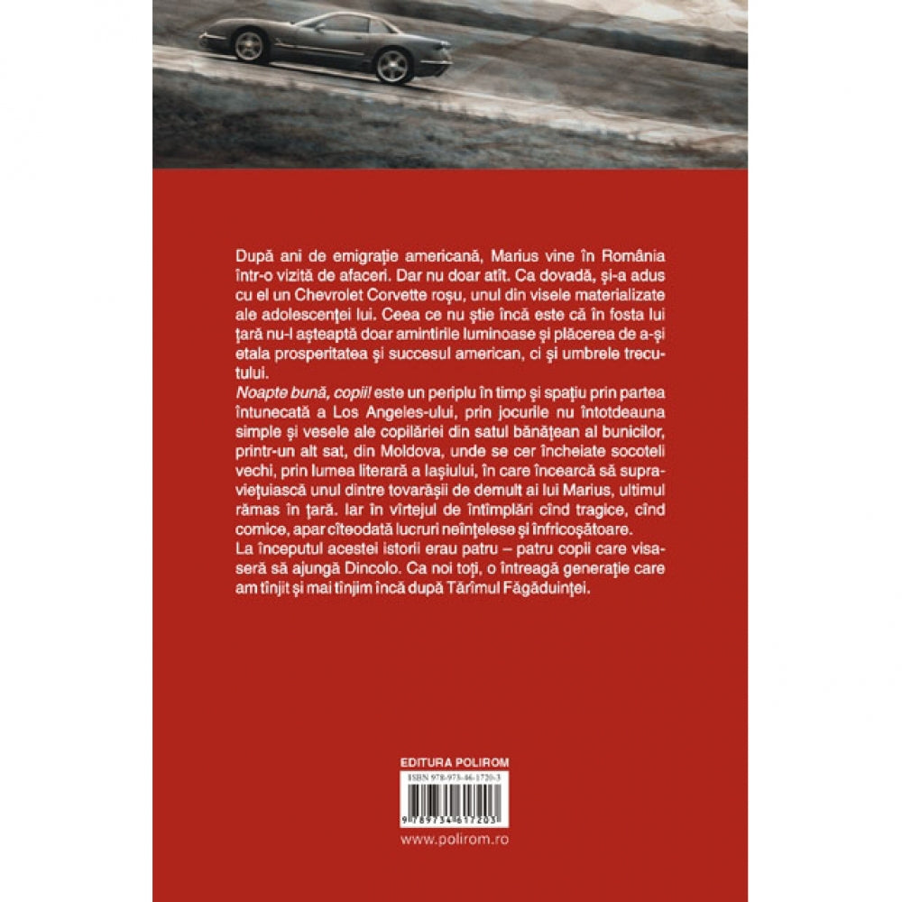 Noapte buna, copii! este un periplu in timp si spatiu prin partea intunecata a Los Angeles-ului, prin jocurile nu intotdeauna simple si vesele ale copilariei din satul banatean al bunicilor, printr-un alt sat, din Moldova, unde se cer incheiate socoteli vechi, prin lumea literara a Iasiului, in care incearca sa supravietuiasca unul dintre tovarasii de demult ai lui Marius, ultimul ramas in tara. Iar in virtejul de intimplari cind tragice, cind comice, apar citeodata lucruri neintelese si infricosatoare.