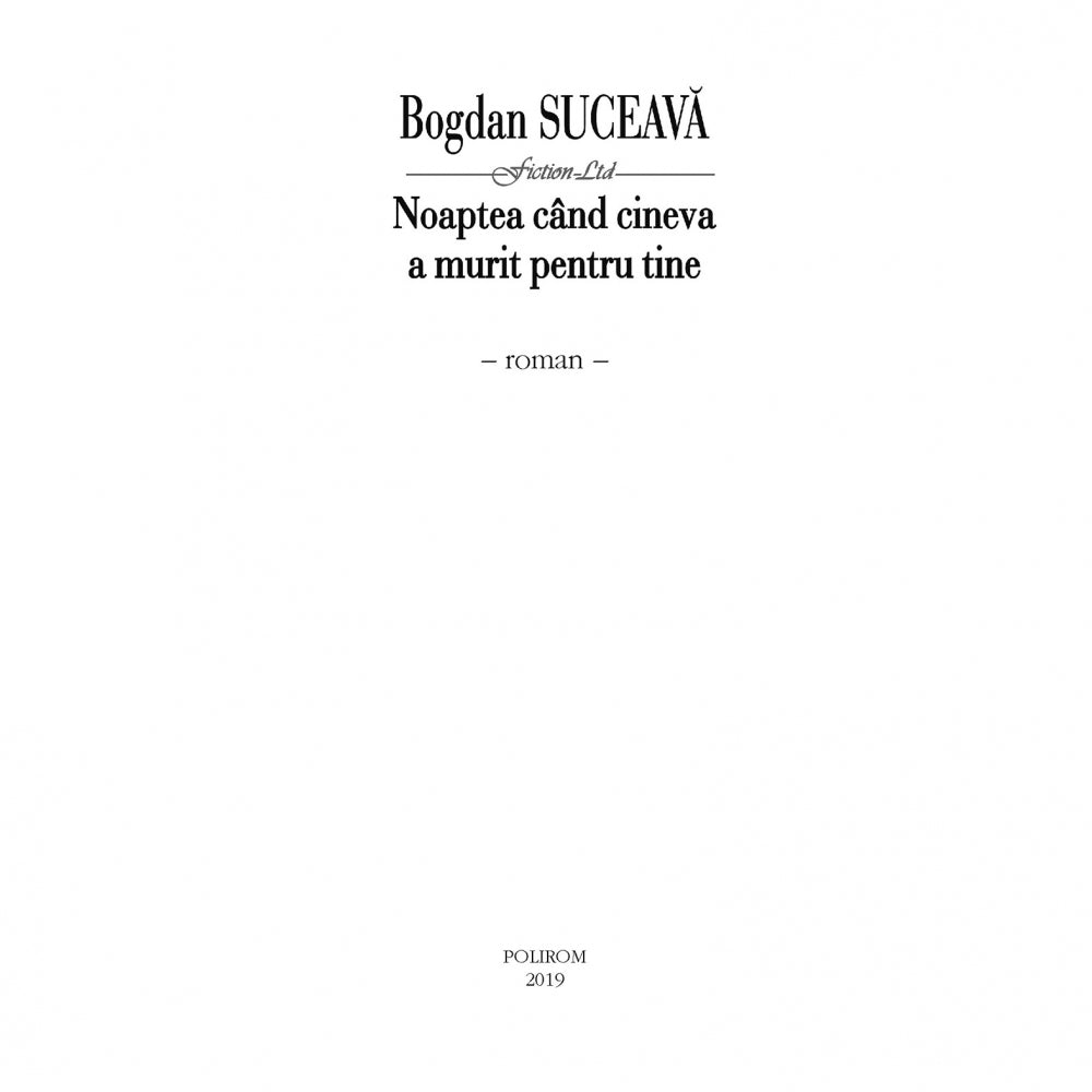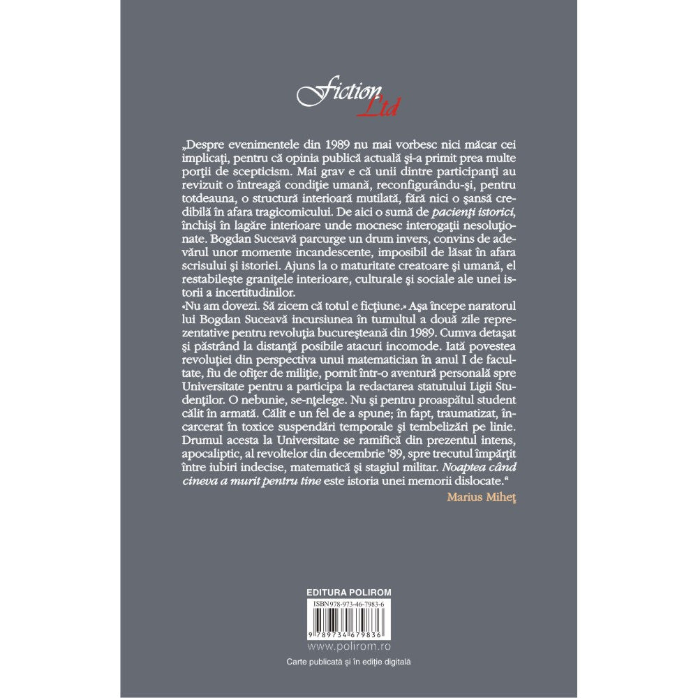 «Nu am dovezi. Sa zicem ca totul e fictiune.» Asa incepe naratorul lui Bogdan Suceava incursiunea in tumultul a doua zile reprezentative pentru revolutia bucuresteana din 1989. Cumva detasat si pastrind la distanta posibile atacuri incomode. Iata povestea revolutiei din perspectiva unui matematician in anul I de facultate, fiu de ofiter de militie, pornit intr-o aventura personala spre Universitate pentru a participa la redactarea statutului Ligii Studentilor. O nebunie, se-ntelege. Nu si pentru proaspatul student calit in armata. Calit e un fel de a spune; in fapt, traumatizat, incarcerat in toxice suspendari temporale si tembelizari pe linie. Drumul acesta la Universitate se ramifica din prezentul intens, apocaliptic, al revoltelor din decembrie ’89, spre trecutul impartit intre iubiri indecise, matematica si stagiul militar. Noaptea cind cineva a murit pentru tine este istoria unei memorii dislocate.” (Marius Mihet)