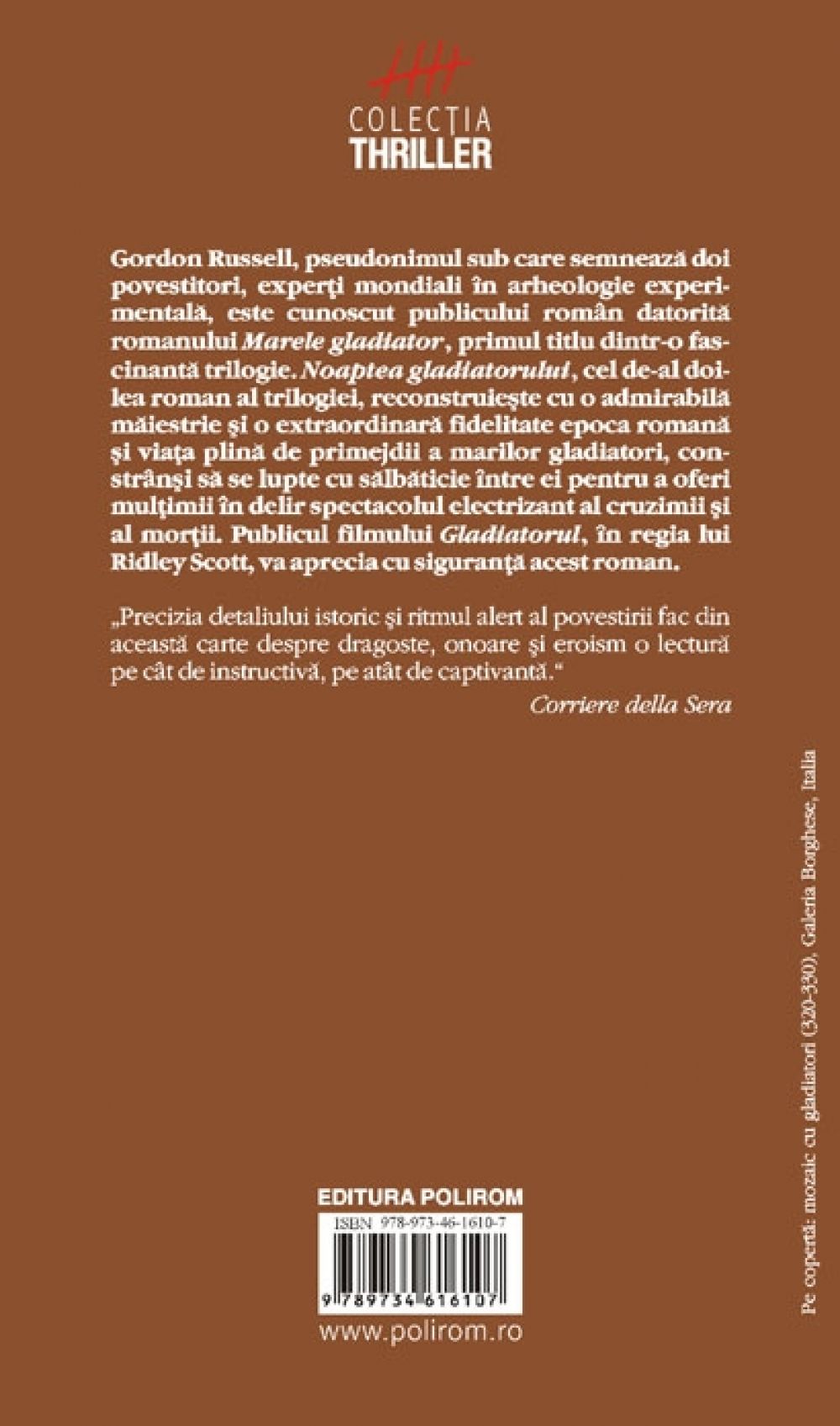 Gordon Russell, pseudonimul sub care semneaza doi povestitori, experti mondiali in arheologie experimentala, este cunoscut publicului roman datorita romanului Marele gladiator, primul titlu dintr-o fascinanta trilogie. Noaptea gladiatorului, cel de-al doilea roman al trilogiei, reconstruieste cu o admirabila maiestrie si o extraordinara fidelitate epoca romana si viata plina de primejdii a marilor gladiatori, constrinsi sa se lupte cu salbaticie intre ei pentru a oferi multimii in delir spectacolul electrizant al cruzimii si al mortii. Publicul filmului Gladiatorul, in regia lui Ridley Scott, va aprecia cu siguranta acest roman.