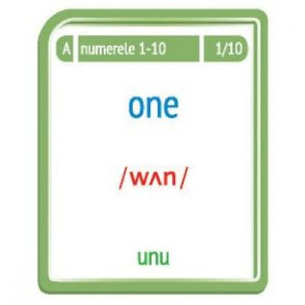 • 56 de carduri cu control al pozitiei. Fiecare card contine pe o fata imaginea, iar pe verso cuvantul din limba engleza corespunzator, insotit de traducere si transcriere fonetica;
