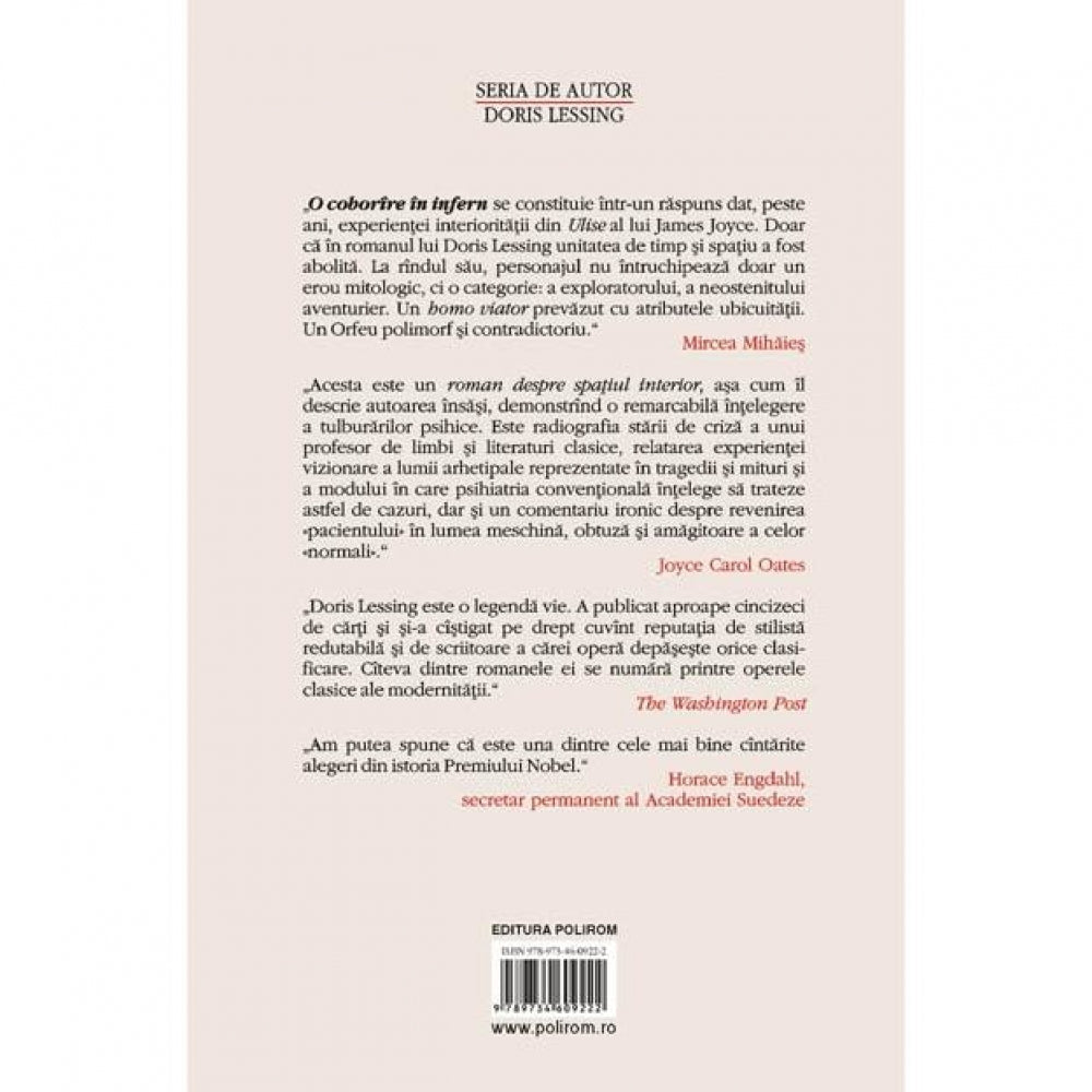 Romanul „O coborire in infern”, nominalizat la Booker Prize in 1971, este primul din Seria de autor „Doris Lessing” care apare in colectia „Biblioteca Polirom”.