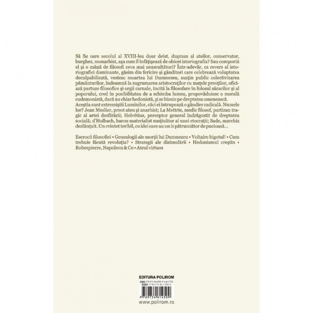 Sa fie oare secolul al XVIII-lea doar deist, dusman al ateilor, conservator, burghez, monarhist, asa cum il infatiseaza de obicei istoriografia? Sau comporta el si o mina de filosofi ceva mai neascultatori? Intr-adevar, ca revers al istoriografiei dominante, gasim din fericire si ginditori care celebreaza voluptatea deculpabilizata, vestesc moartea lui Dumnezeu, sustin public colectivizarea paminturilor, indeamna la sugrumarea aristocratilor cu matele preotilor, oficiaza partuze filosofice si orgii carnale, incita la filosofare in folosul saracilor si al poporului, cred in posibilitatea de a schimba lumea, propovaduiesc o morala eudemonista, daca nu chiar hedonista, si se bizuie pe dreptatea omeneasca. Acestia sint extremistii Luminilor, caci eiintrupeaza o gindire radicala. Numele lor? Jean Meslier, preot ateu si anarhist; La Mettrie, medic filosof, partizan tragic al artei desfatarii; Helvetius, perceptor general indragostit de dreptatea sociala; d’Holbach, baron materialist sustinator al unei etocratii; Sade, marchiz dezlantuit. Un cvintet teribil, cu idei care au un iz patrunzator de pucioasa...
