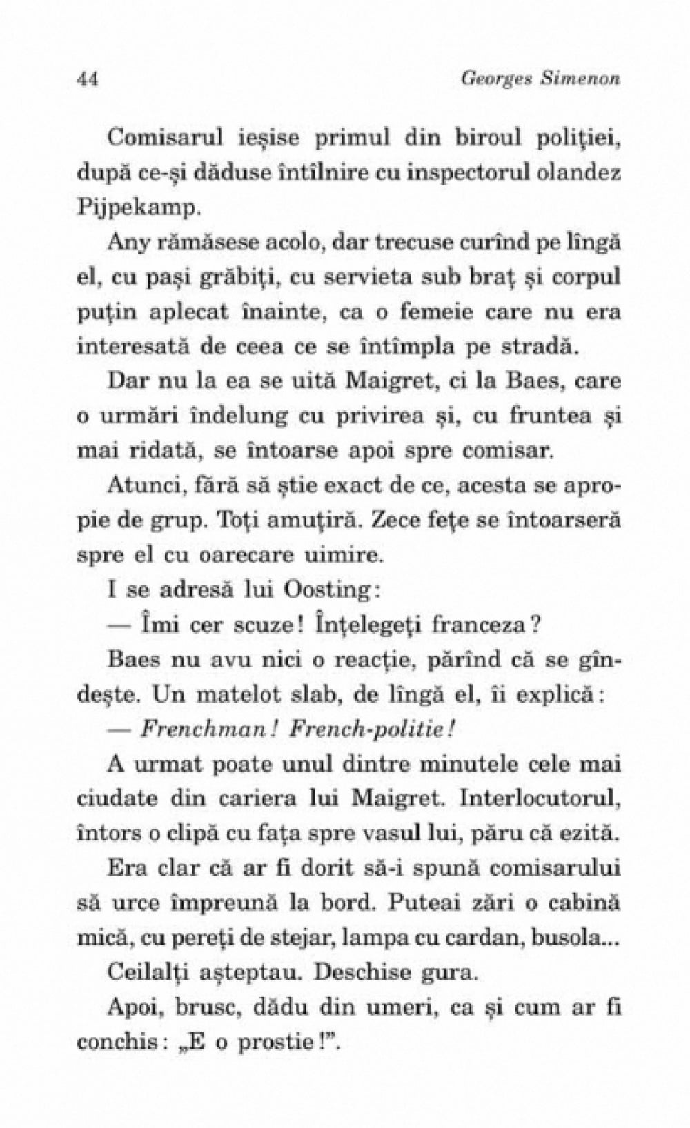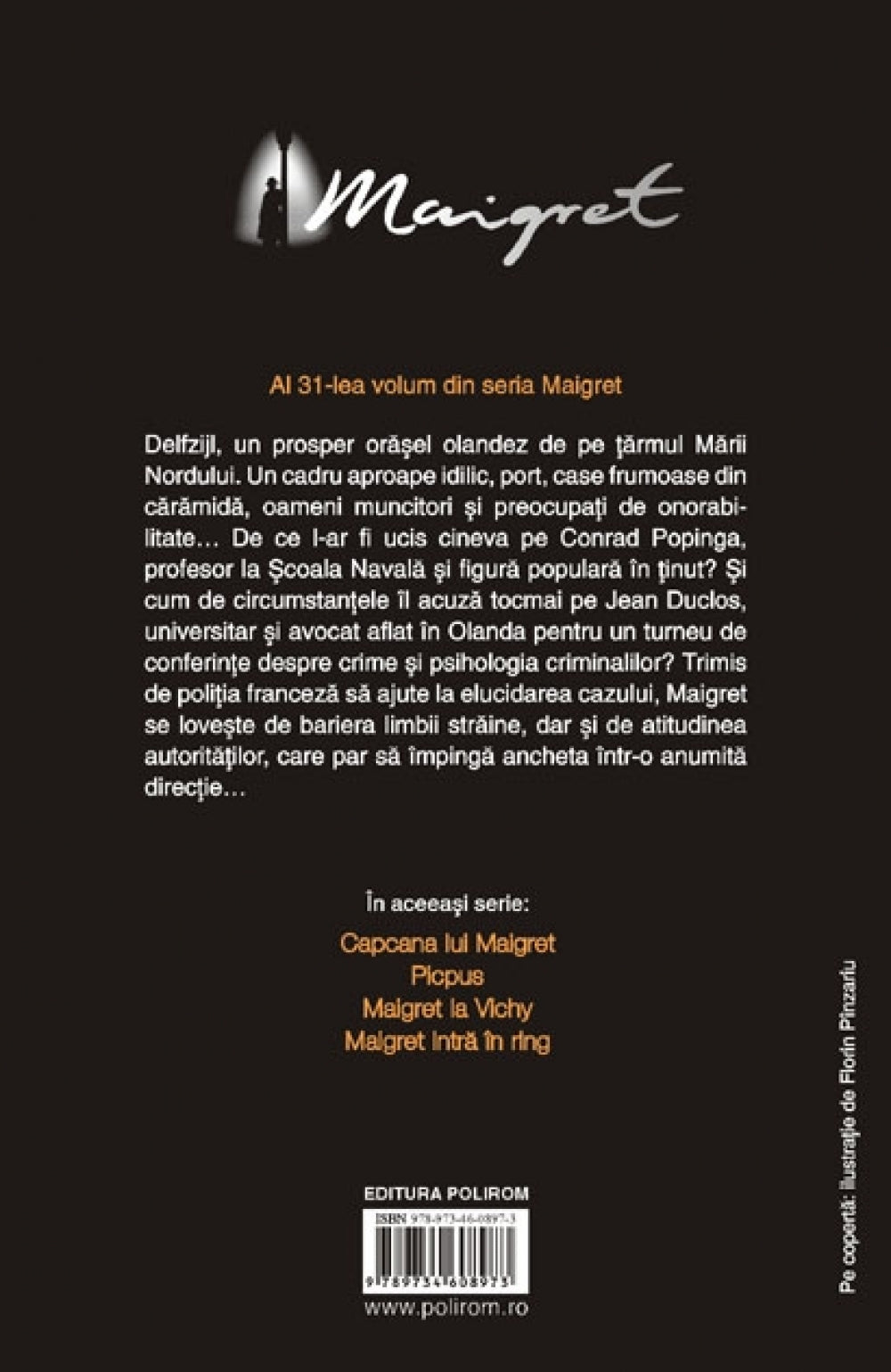 Delfzijl, un prosper orasel olandez de pe tarmul Marii Nordului. Un cadru aproape idilic, port, case frumoase din caramida, oameni muncitori si preocupati de onorabilitate... De ce l-ar fi ucis cineva pe Conrad Popinga, profesor la Scoala Navala si figura populara in tinut? Si cum de circumstantele il acuza tocmai pe Jean Duclos, universitar si avocat aflat in Olanda pentru un turneu de conferinte despre crime si psihologia criminalilor? Trimis de politia franceza sa ajute la elucidarea cazului, Maigret trebuie sa lupte cu bariera limbii straine, dar si cu atitudinea autoritatilor, care par sa impinga ancheta intr-o anumita directie...