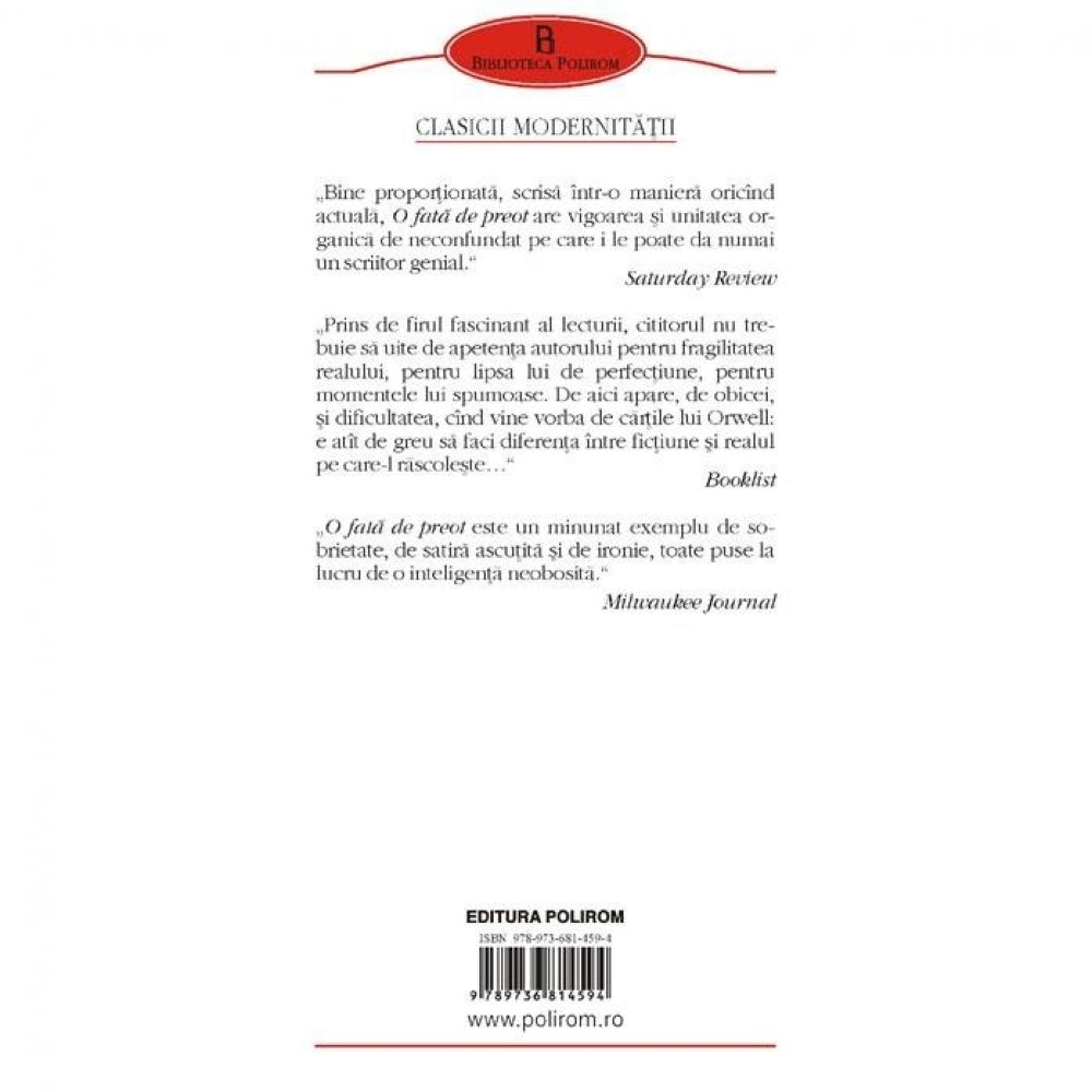 O fata de preot, roman cenzurat de exigentele vremurilor in care a aparut pentru prima data, este publicat in aceasta colectie intr-o traducere cit mai apropiata de originalul propus de Orwell – acesta s-a pierdut, insa anumite pasaje au putut fi reconstruite.