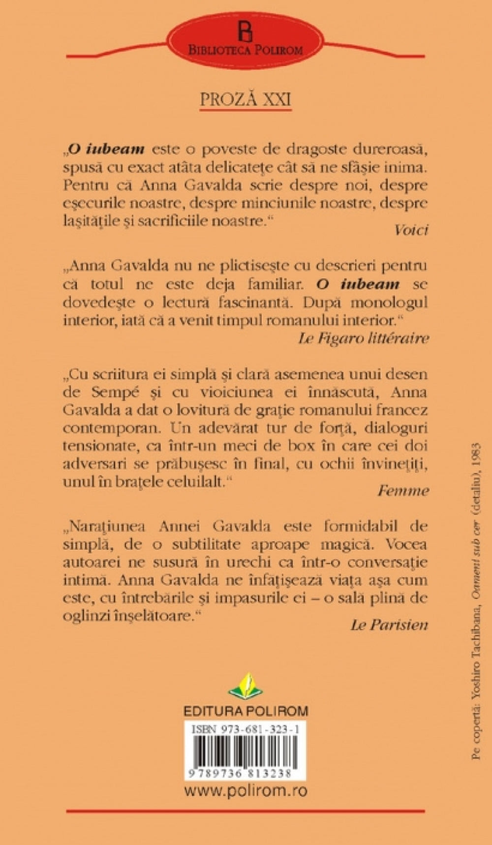 „Anna Gavalda nu ne plictiseste cu descrieri pentru ca totul ne este deja familiar. «O iubeam» se dovedeste o lectura fascinanta. Dupa monologul interior, iata ca a venit timpul romanului interior.“ (Le Figaro litteraire) „Cu scriitura sa simpla si clara asemenea unui desen de Sempe, precum si cu vioiciunea sa innascuta, Anna Gavalda a dat o lovitura de gratie romanului francez contemporan. Un adevarat tur de forta, dialoguri tensionate, ca intr-un meci de box in care cei doi adversari se prabusesc in final, cu ochii invinetiti, unul in bratele celuilalt.“ (Femme) „Naratiunea Annei Gavalda este, inainte de toate, formidabil de simpla, de o subtilitate aproape magica. Vocea autoarei ne susura in urechi asemenea unei conversatii intime. Anna Gavalda ne infatiseaza viata asa cum este – cu intrebarile si impasurile ei, ca o sala plina de oglinzi inselatoare.“ (Le Parisien)