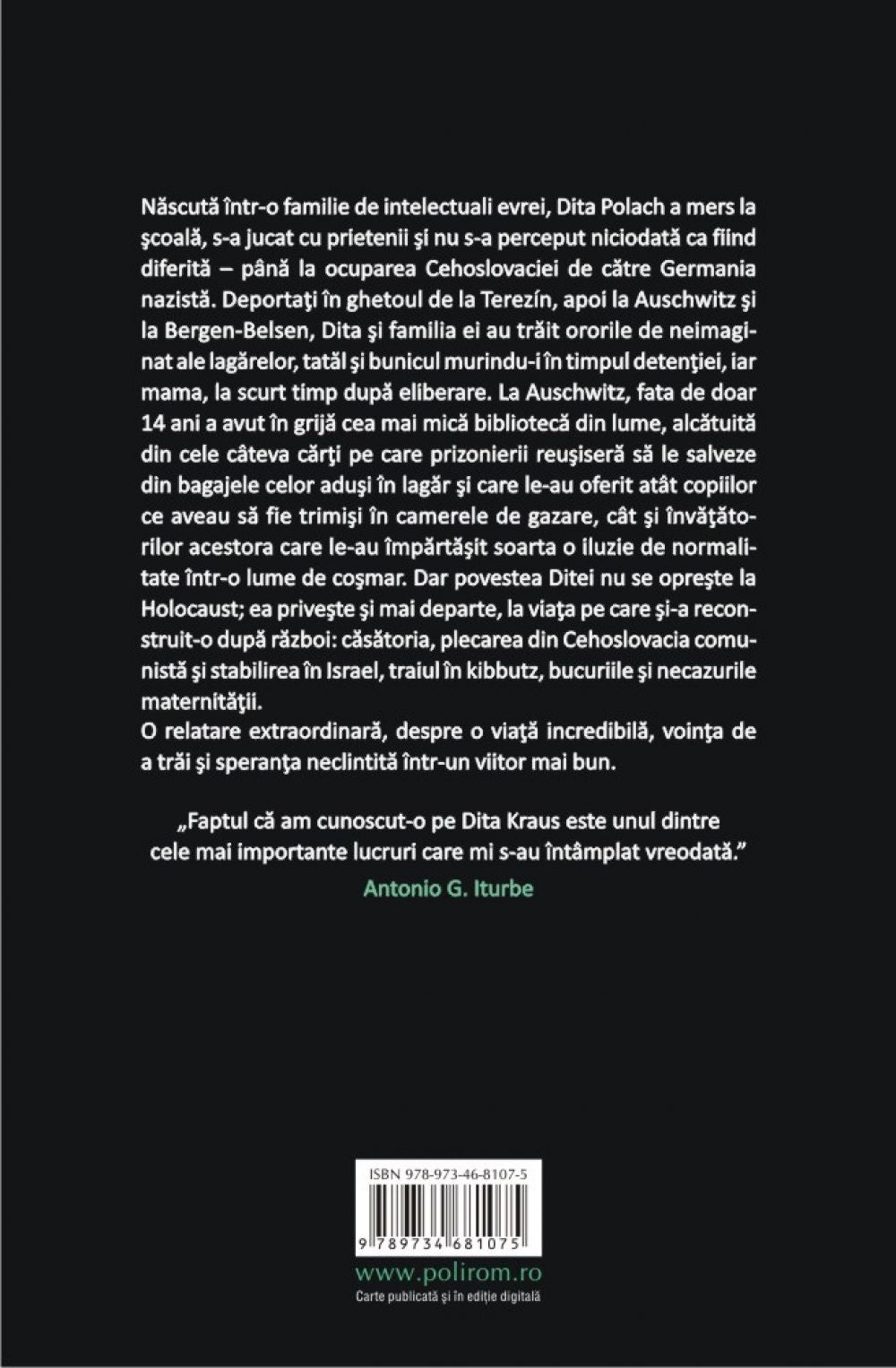 Nascuta într-o familie de intelectuali evrei, Dita Polach a mers la scoala, s-a jucat cu prietenii si nu s-a perceput niciodata ca fiind diferita – pîna la ocuparea Cehoslovaciei de catre Germania nazista. Deportati în ghetoul de la Terezín, apoi la Auschwitz si la Bergen-Belsen, Dita si familia ei au trait ororile de neimaginat ale lagarelor, tatal si bunicul murindu-i în timpul detentiei, iar mama, la scurt timp dupa eliberare. La Auschwitz, fata de doar 14 ani a avut în grija cea mai mica biblioteca din lume, alcatuita din cele cîteva carti pe care prizonierii reusisera sa le salveze din bagajele celor adusi în lagar si care le-au oferit atît copiilor ce aveau sa fie trimisi în camerele de gazare, cît si învatatorilor acestora care le-au împartasit soarta o iluzie de normalitate într-o lume de cosmar. Dar povestea Ditei nu se opreste la Holocaust; ea priveste si mai departe, la viata pe care si-a reconstruit-o dupa razboi: casatoria, plecarea din Cehoslovacia comunista si stabilirea în Israel, traiul în kibbutz, bucuriile si necazurile maternitatii. O relatare extraordinara, despre o viata incredibila, vointa de a trai si speranta neclintita într-un viitor mai bun.