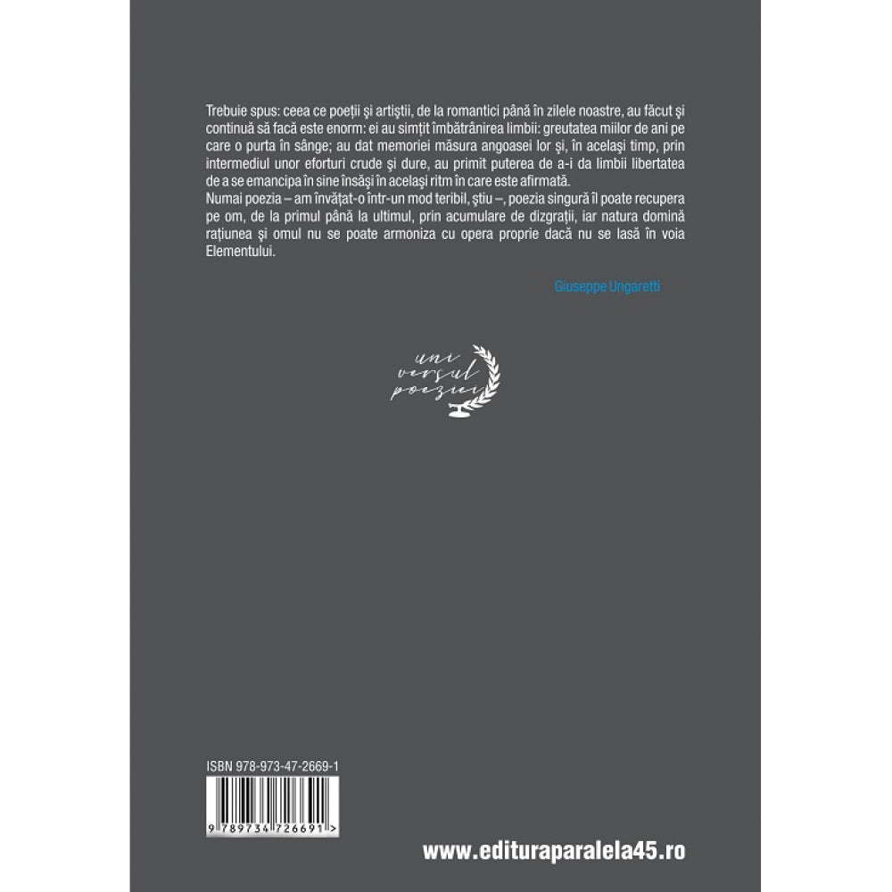 Numai poezia – am invatat-o intr-un mod teribil, stiu –, poezia singura il poate recupera pe om, de la primul pana la ultimul, prin acumulare de dizgratii, iar natura domina ratiunea si omul nu se poate armoniza cu opera proprie daca nu se lasa in voia Elementului.