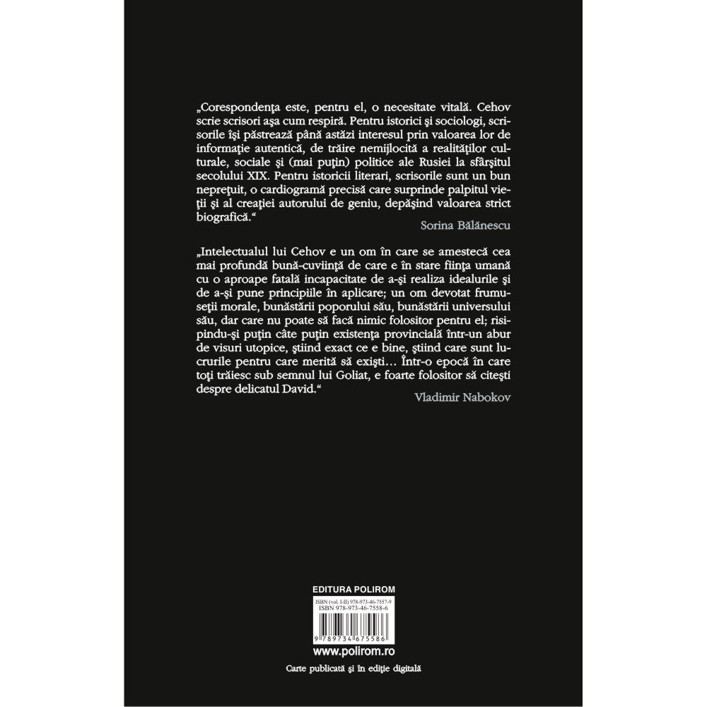 Am de gind sa-mi sigilez toate scrisorile si sa le las prin testament, cu clauza sa fie desigilate peste 50 de ani...”, glumea Cehov, dupa ce citise un articol inflamat al lui A.I. Goncearov despre dreptul scriitorilor de a dispune interzicerea publicarii postume a unor texte de interes privat. Era sau nu era Cehov constient de valoarea propriilor scrisori in postumitate? Este o intrebare la care raspunsul intirzie. Cert este ca, in numai 29 de ani (scriitorul se sfirsea la 2 iulie 1904), a expediat aproape 4.400 de scrisori. Din lunga serie, acest prim volum selecteaza o parte restrinsa, care are in vedere mai degraba momente din viata literara a autorului, decit detaliile marunte ale vietii de zi cu zi.