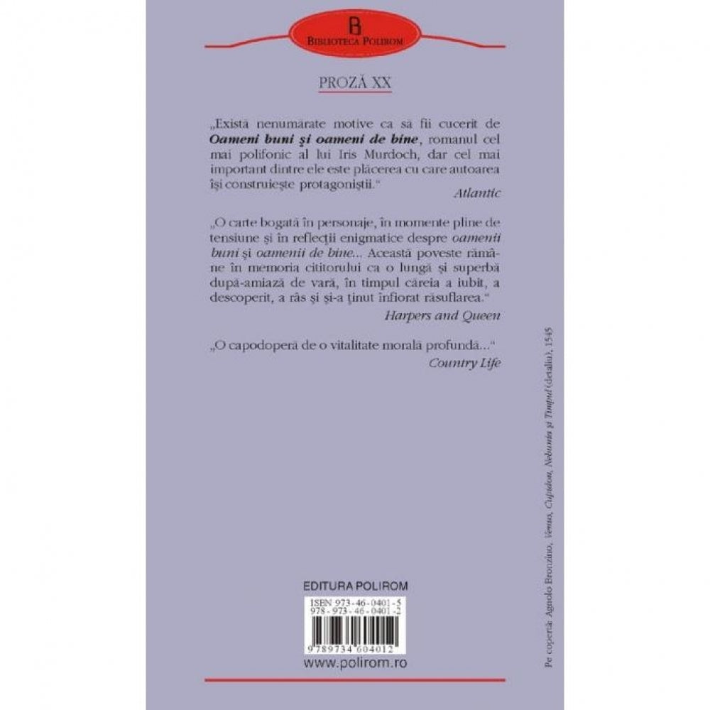 Oameni buni si oameni de bine este unul dintre romanele cele mai dinamice si mai captivante ale autoarei: folosind ca pretext o trama politista, cu accente gotice, romanciera pune in scena o intreaga lume, cu personaje dintre cele mai diverse. Sinuciderea misterioasa a unui inalt functionar guvernamental pasionat de magia neagra declanseaza o ancheta interna, cu care este insarcinat protagonistul cartii, John Ducane. Dar, pe masura ce-si desfasoara investigatia, acesta descopera totodata viata ascunsa a apropiatilor sai: santaj, frustrari adolescentine, obsesii erotice, iubiri nemarturisite. In universul construit de Iris Murdoch, valori individuale fundamentale precum iubirea sau prietenia se confrunta cu valorile morale ale societatii – legea, dreptatea, ordinea. Cu slabiciunile si pacatele lor, dar si cu puterea de a iubi si de a se sacrifica.