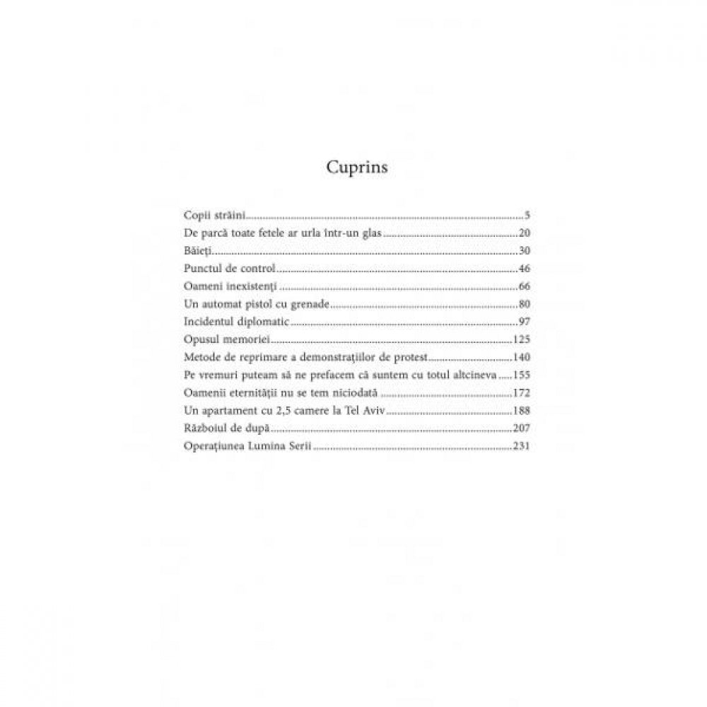 Oamenii eternitatii nu se tem niciodataare in centru trei prietene adolescente israeliene, Yael, Avisag si Lea, dintr-un sat prafuit de linga granita cu Libanul, care isi indeplinesc serviciul militar intr-o atmosfera ce penduleaza intre plictis si teroare. Lea pazeste un punct de frontiera spre Cisiordania, verificind permisele palestinienilor care patrund in Israel, si, ca sa-si alunge plictiseala, isi imagineaza povestile lor de viata. Avisag pazeste granita egipteana, avind in sarcina oprirea emigrantilor ilegali si a filmelor porno piratate, privind in fiecare zi cum refugiatii se izbesc cu disperare de sirma ghimpata, iar Yael face instructie de trageri si flirteaza cu baieti mai mici decit ea. Toate trei asteapta in praful granitei sa se intimple ceva, prinse mereu in clipa intensa de dinaintea izbucnirii unei nenorociri. Tonul romanului imbina umorul sardonic cu patosul, creind un stil cu totul personal, undeva intre sarcasmul lui Etgar Keret si talentul epic al lui David Grossman.