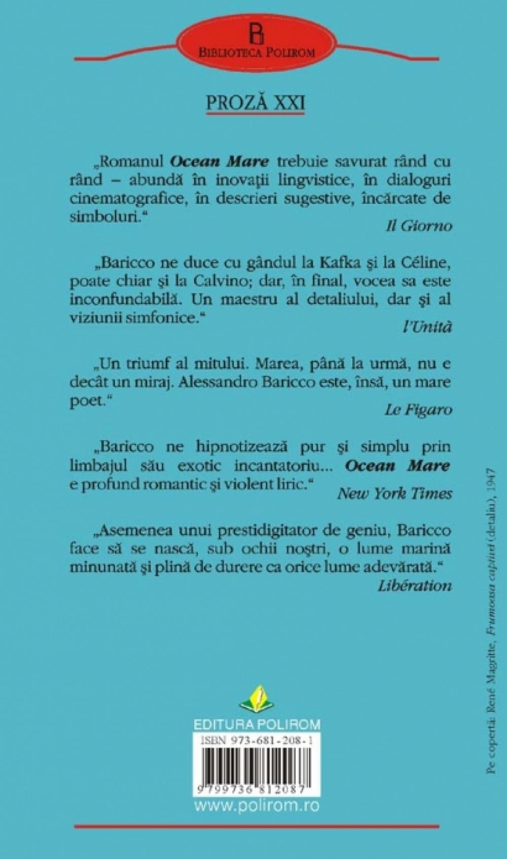 Traducere si postfata de Adrian Popescu. Romanul este un elogiu adus marii, in egala masura regeneratoare si distructiva, un imn inchinat puterilor tamaduitoare ale apei. Intr-un han de pe tarmul marii se intilnesc tot felul de personaje insolite, iar povestile vietii lor se alcatuiesc din jocul liber al compozitiei de factura postmoderna. Paginile de intens lirism alterneaza cu cele de un realism crud: lupta pentru supravietuire, in momentul unui naufragiu, scotind la iveala bestialitatea ascunsa in launtrul omului civilizat. Insa sensul adinc al cartii ramine acela al increderii nestramutate in energiile regeneratoare ale omenirii.