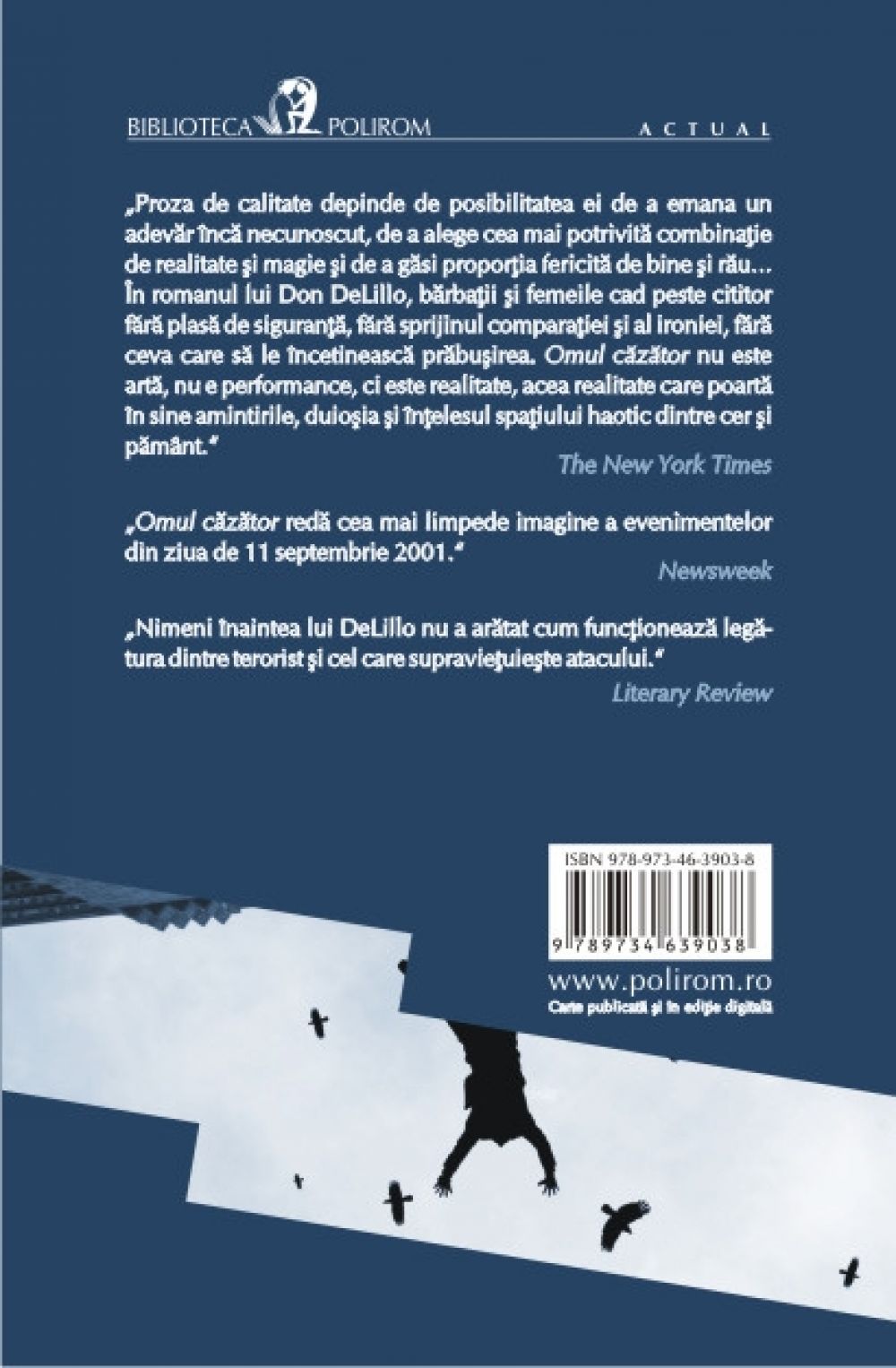 „Proza de calitate depinde de posibilitatea ei de a emana un adevar inca necunoscut, de a alege cea mai potrivita combinatie de realitate si magie si de a gasi proportia fericita de bine si rau… In romanul lui Don DeLillo, barbatii si femeile cad peste cititor fara plasa de siguranta, fara sprijinul comparatiei si al ironiei, fara ceva care sa le incetineasca prabusirea. Omul cazator nu este arta, nu e performance, ci este realitate, acea realitate care poarta in sine amintirile, duiosia si intelesul spatiului haotic dintre cer si pamint.” (The New York Times)
