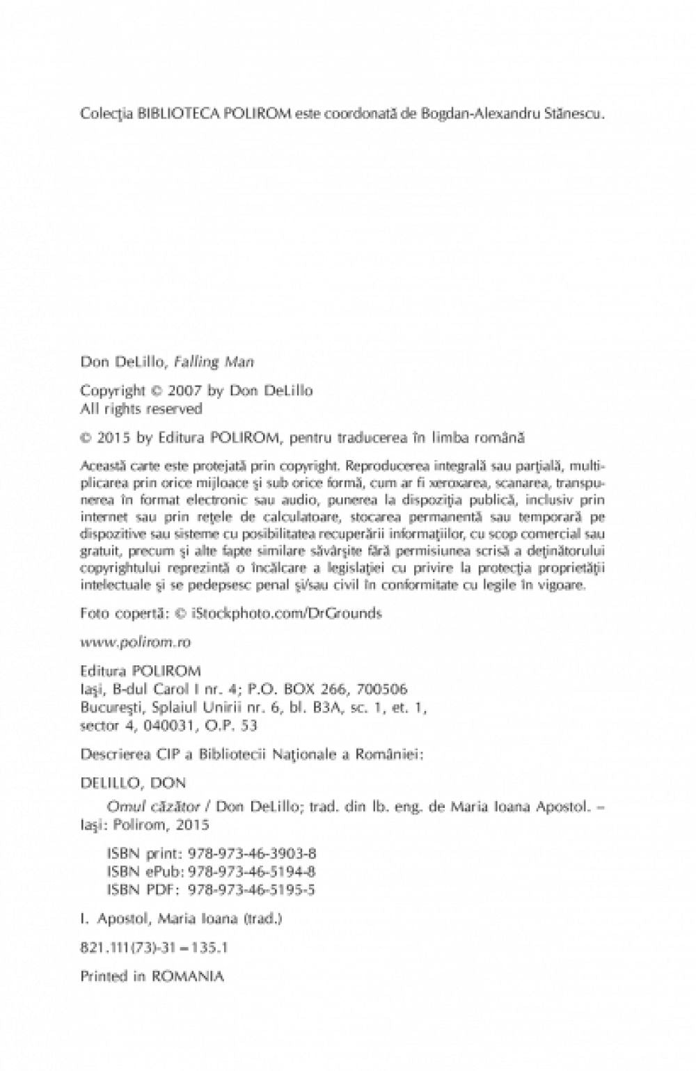Dupa ce iese acoperit de cenusa si de singele altora din Turnul de nord, Keith Neudecker hotaraste, aproape inconstient, ca singura lui sansa e sa se intoarca la familia pe care o lasase in urma, la lumea pe care o cunostea cel mai bine. Numai ca, dupa 11 septembrie 2001, totul s-a schimbat. Justin, fiul lui, se uita intruna cu binoclul pe cer, cu gindul la Bill Lawton (o versiune fictionala a lui Bin Laden) sau la vreun alt avion menit sa aduca distrugere. Sotia sa, Lianne, macinata de spaima, vede Islamul peste tot: in carti postale de la prieteni, in muzica vecinilor, in orice o inconjoara. Peste toti cei instrainati, care nu se mai recunosc pe ei insisi, planeaza figura artistului cunoscut sub numele de Omul cazator care, suspendat deasupra multimilor, le aminteste tuturor, iar si iar, imaginea inghetata in timp a supremei disperari, cea a oamenilor cazind din turnurile in flacari.