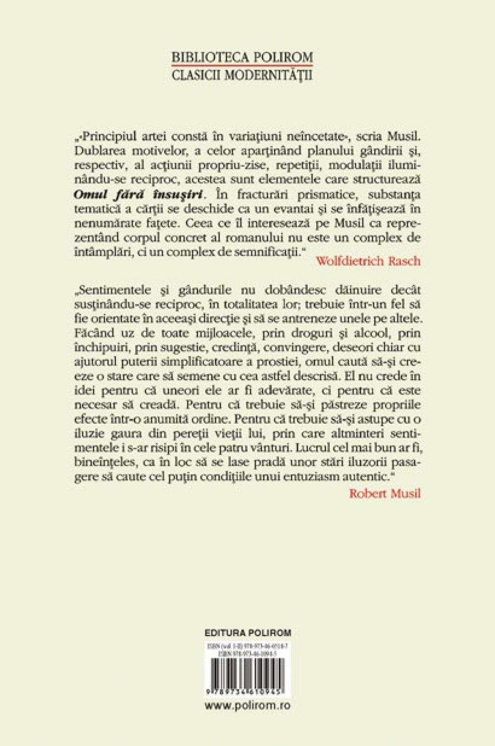 Un roman de referinta al secolului XX si una dintre capodoperele modernismului literar. Actiunea este plasata in Viena lui Freud si Schnitzler, in perioada imediat anterioara izbucnirii Primului Razboi Mondial, si il are in centru pe Ulrich, un matematician a carui atitudine pasiva si indiferenta fata de viata a fost considerata simptomatica pentru momentul istoric al declinului utopiei imperiale. In spiritul marelui roman realist de secol XIX, intentia lui Musil este de a realiza o ampla fresca sociala, cuprinzind categoriile cele mai reprezentative – de la membri ai inaltei societati a timpului pina la elemente ale lumii interlope – si tipuri morale si psihologice de o mare varietate. Contextul istoric, marcat de tensiunea dintre constiinta unui declin inevitabil si delirul grandorii, isi pune amprenta asupra personajelor: fapturi nevrotice sau dea dreptul demente, cu o sexualitate devianta (ultima parte a romanului este dominata de relatia incestuoasa a lui Ulrich cu sora lui, Agathe), vestigii ale unei epoci pe cale de a se stinge. Adevarat precursor al romanului negru postbelic, Musil este, totodata, unul dintre scriitorii care au reusit sa impuna o viziune articulata si emblematica a Europei Centrale si a tarelor, complexelor si aspectelor ei intunecate.
