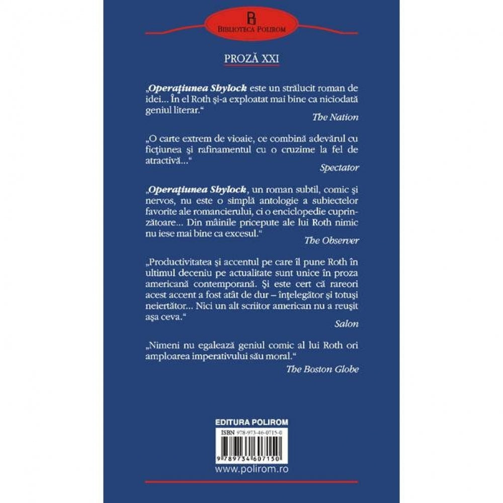 „Operatiunea Shylockeste un stralucit roman de idei... In el Roth si-a exploatat mai bine ca niciodata geniul literar.”(The Nation)