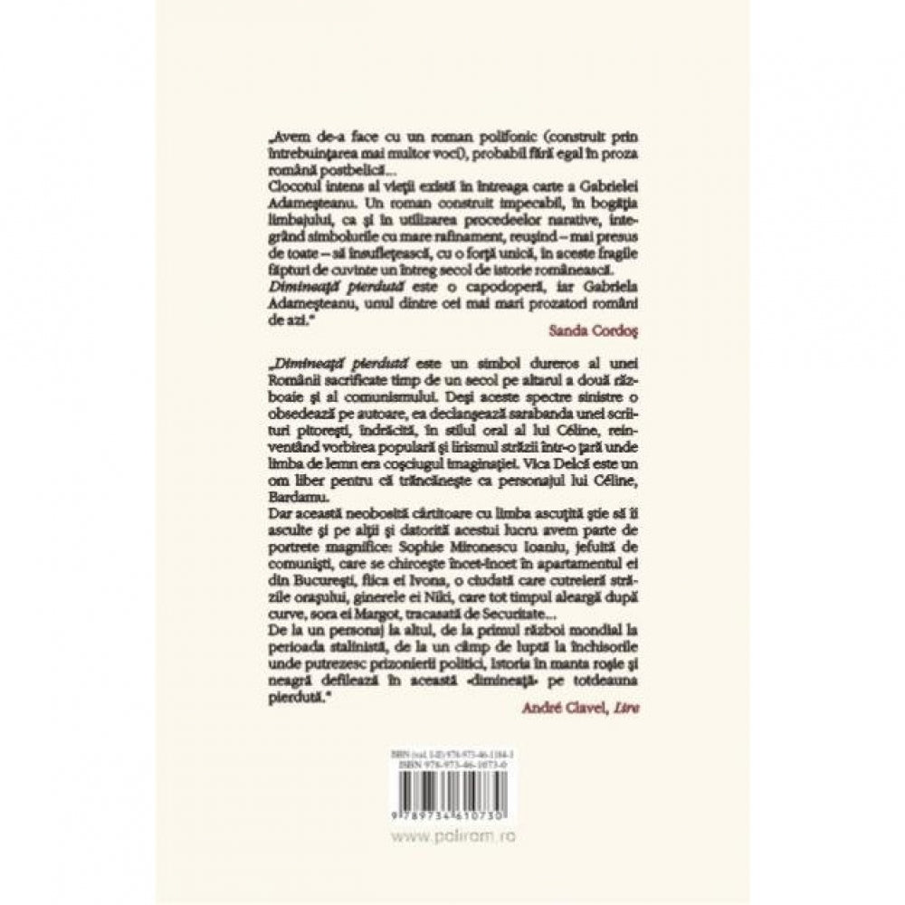 Dimineata pierduta a primit Premiul pentru Proza al Uniunii Scriitorilor. Dramatizat de Catalina Buzoianu la Teatrul Bulandra (1986). Adaptare radiofonica (2006). Publicat in Estonia (1991), Franta (2005), Bulgaria (2007), Israel (2007). Va aparea in 2009 in Spania si Ungaria. „O dimineata «pierduta», dar un veac cistigat, se poate spune in legatura cu romanul Gabrielei Adamesteanu si cu titlul lui. El transmite nu numai un puternic sentiment al istoriei, ci si un puternic, extraordinar sentiment al vietii si, mai ales, al trecerii ei... Personajele se afla cind intr-un plan temporal, cind in altul. Ii vedem tineri si batrini, copii, adolescenti, adulti. Mortii invie si incep sa traiasca in fata ochilor nostri o intensa viata, iar despre cei vii aflam ca de fapt au murit.