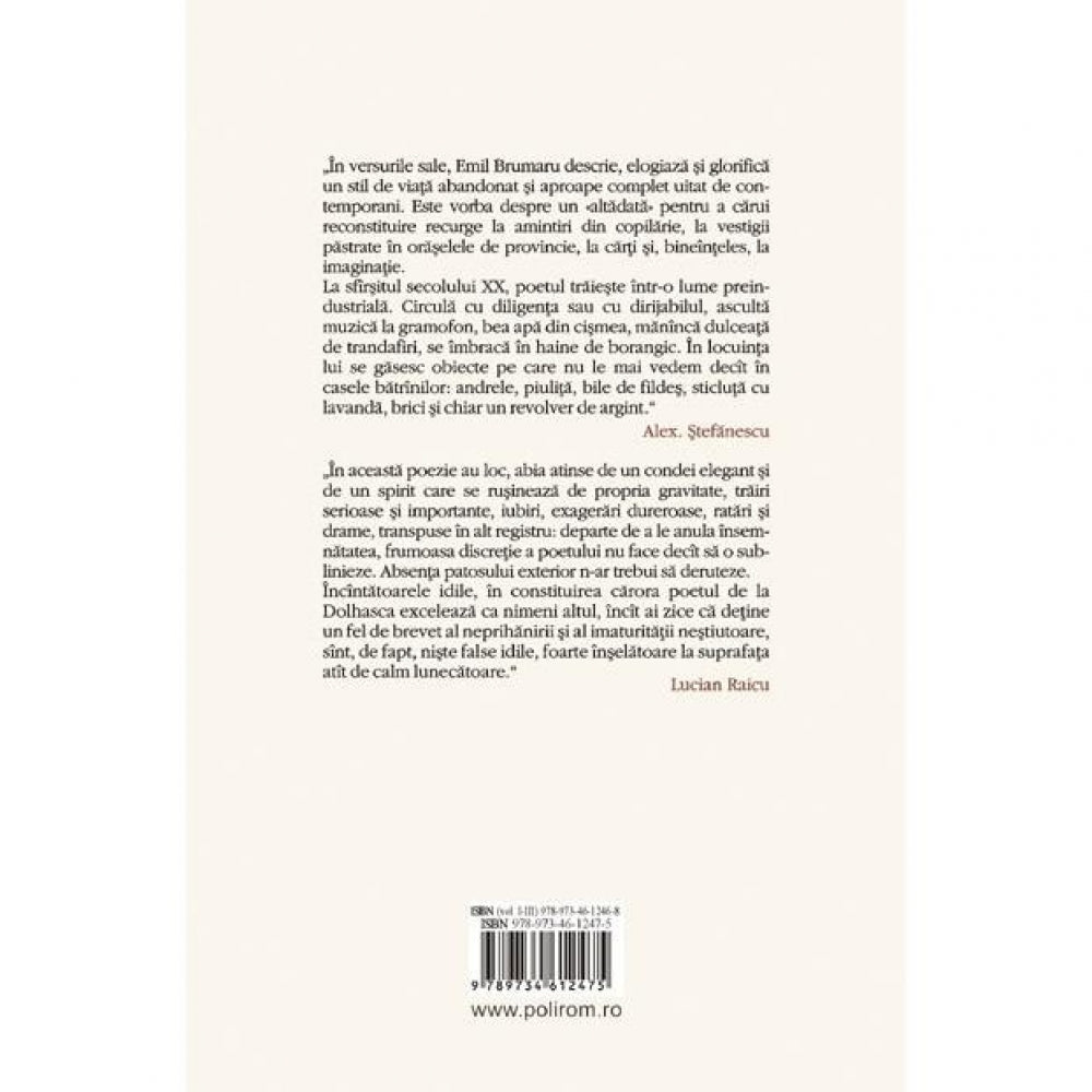 „In versurile sale, Emil Brumaru descrie, elogiaza si glorifica un stil de viata abandonat si aproape complet uitat de contemporani. Este vorba despre un «altadata» pentru a carui reconstituire recurge la amintiri din copilarie, la vestigii pastrate in oraselele de provincie, la carti si, bineinteles, la imaginatie. La sfirsitul secolului XX, poetul traieste intr-o lume preindustriala. Circula cu diligenta sau cu dirijabilul, asculta muzica la gramofon, bea apa din cismea, maninca dulceata de trandafiri, se imbraca in haine de borangic. In locuinta lui se gasesc obiecte pe care nu le mai vedem decit in casele batrinilor: andrele, piulita, bile de fildes, sticluta cu lavanda, brici si chiar un revolver de argint.”(Alex. Stefanescu)