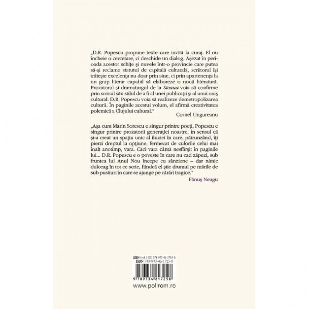 „D.R. Popescu propune texte care invita la curaj. El nu incheie o cercetare, ci deschide un dialog. Asezat in perioada acestor schite si nuvele intr-o provincie care putea sa-si reclame statutul de capitala culturala, scriitorul isi traieste excelenta nu doar prin sine, ci prin apartenenta la un grup literar capabil sa elaboreze o noua literatura. Prozatorul si dramaturgul de la Steaua voia sa confirme prin scrisul sau stilul de a fi al unei publicatii si al unui oras cultural. D.R. Popescu voia sa realizeze demetropolizarea culturii. In paginile acestui volum, el afirma creativitatea polemica a Clujului cultural.” (Cornel Ungureanu)