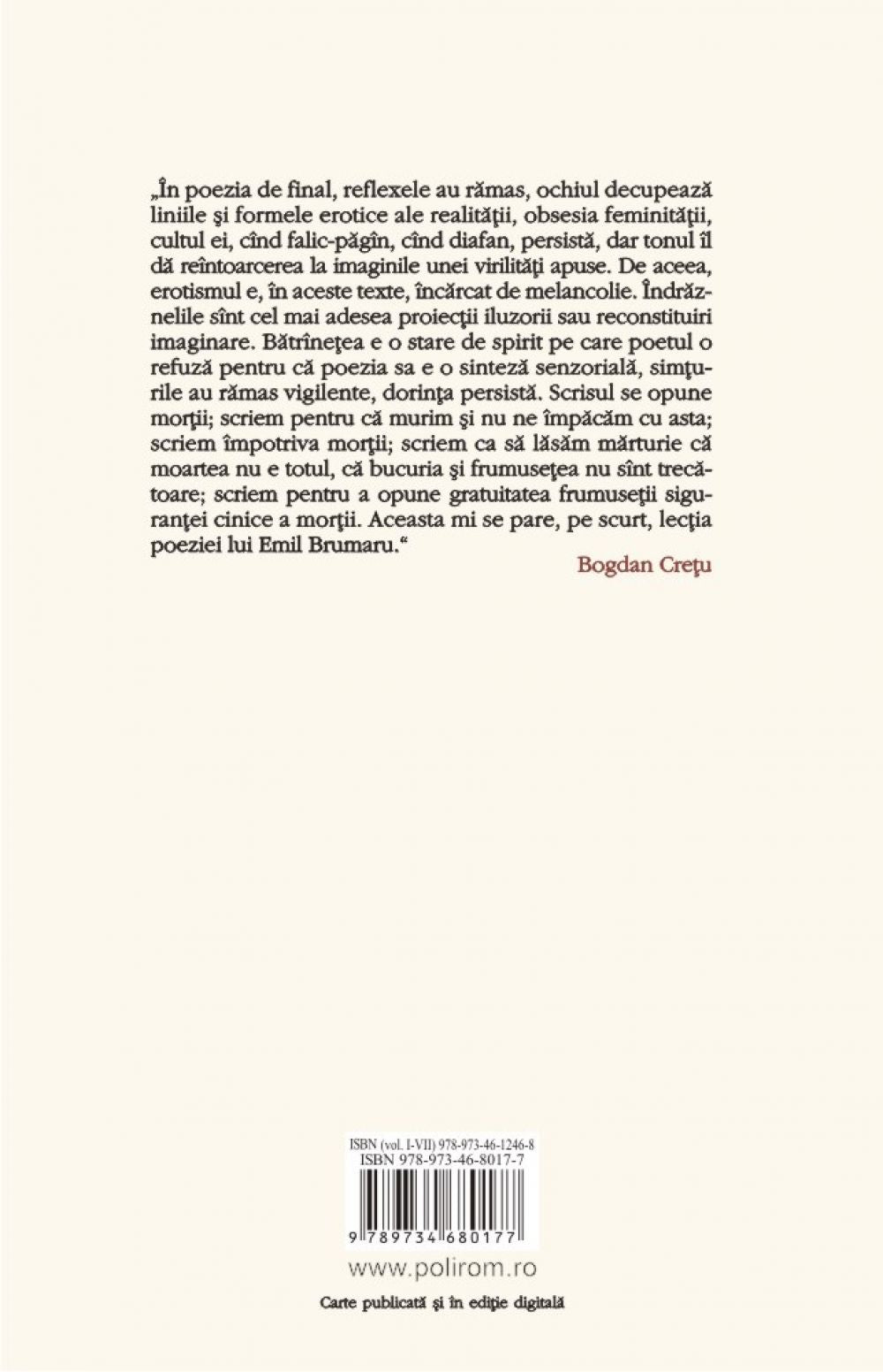 „În poezia de final, reflexele au ramas, ochiul decupeaza liniile si formele erotice ale realitatii, obsesia feminitatii, cultul ei, cînd falic-pagîn, cînd diafan, persista, dar tonul îl da reîntoarcerea la imaginile unei virilitati apuse. De aceea, erotismul e, în aceste texte, încarcat de melancolie. Îndraznelile sînt cel mai adesea proiectii iluzorii sau reconstituiri imaginare. Batrînetea e o stare de spirit pe care poetul o refuza pentru ca poezia sa e o sinteza senzoriala, simturile au ramas vigilente, dorinta persista. Scrisul se opune mortii; scriem pentru ca murim si nu ne împacam cu asta; scriem împotriva mortii; scriem ca sa lasam marturie ca moartea nu e totul, ca bucuria si frumusetea nu sînt trecatoare; scriem pentru a opune gratuitatea frumusetii sigurantei cinice a mortii. Aceasta mi se pare, pe scurt, lectia poeziei lui Emil Brumaru.” (Bogdan Cretu)