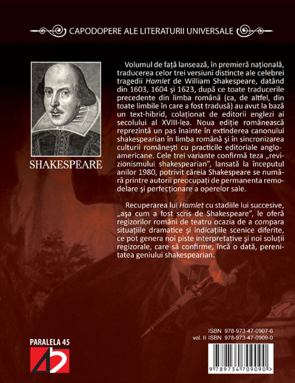 Volumul de fata lanseaza, in premiera nationala, traducerea celor trei versiuni distincte ale celebrei tragedii Hamlet de William Shakespeare, datand din 1603, 1604 si 1623, dupa ce toate traducerile precedente din limba romana (ca, de altfel, din toate limbile in care a fost tradusa) au avut la baza un text-hibrid, colationat de editorii englezi ai secolului al XVIII-lea. Noua editie romaneasca reprezinta un pas inainte in extinderea canonului shakespearian in limba romana si in sincronizarea culturii romanesti cu practicile editoriale anglo-americane. Cele trei variante confirma teza revizionismului shakespearian, lansata la inceputul anilor 1980, potrivit careia Shakespeare se numara printre autorii preocupati de permanenta remodelare si perfectionare a operelor sale.