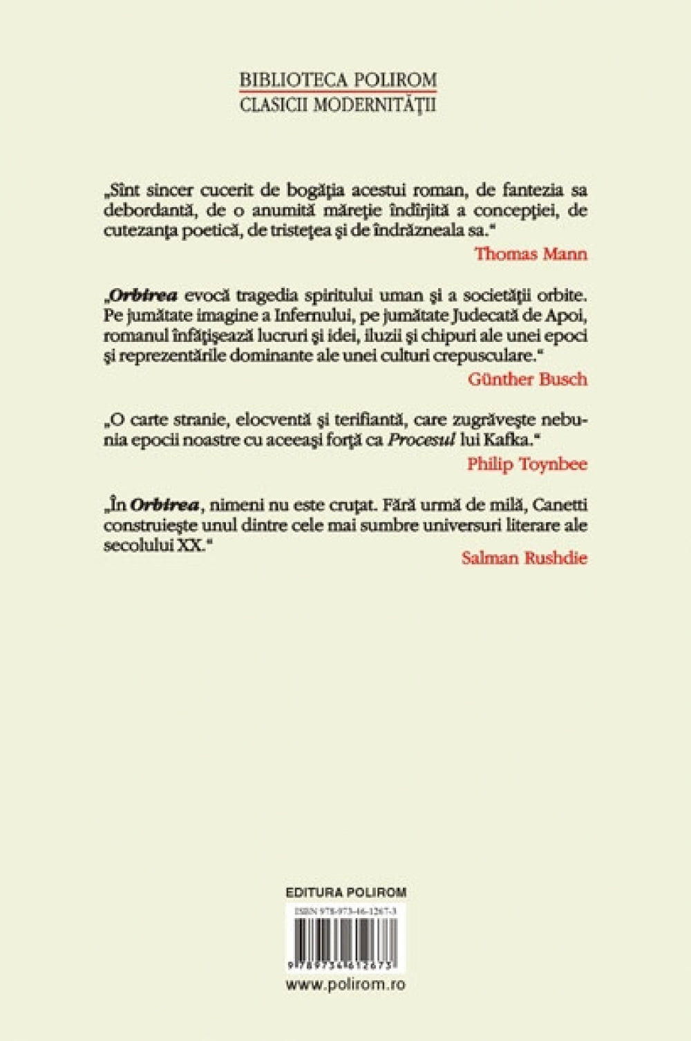 Faima mondiala a romanului Orbirea, scris cind Elias Canetti avea doar douazeci si sase de ani, a venit tirziu, intirziata de evenimente politice, desi importanta cartii fusese recunoscuta si salutata cu entuziasm de Thomas Mann, Hermann Broch, Hermann Hesse si altii. Tradusa peste tot in lume, Orbirea face parte dintre marile carti ale literaturii europene din secolul XX.