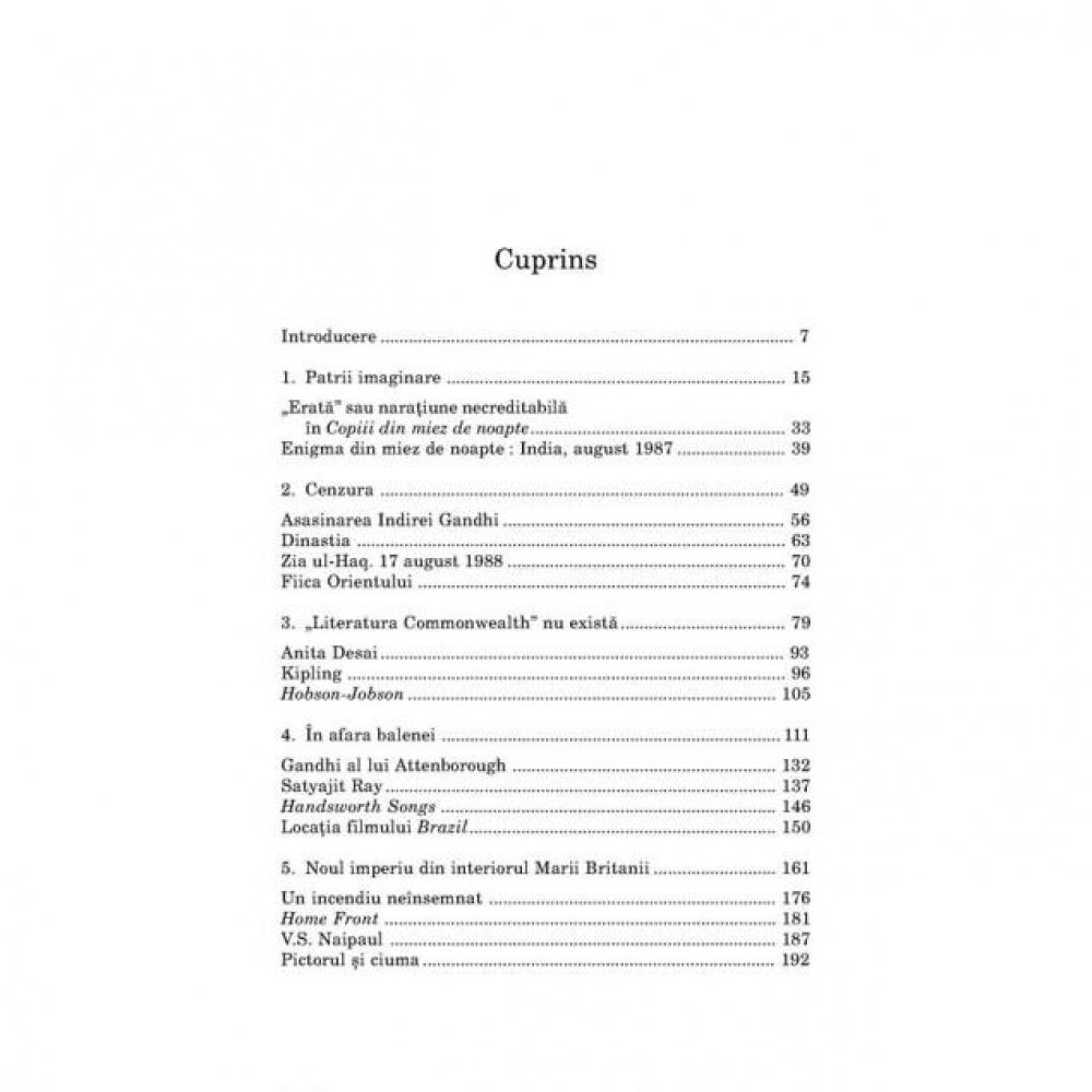 Cuprins:Patrii imaginare • Cenzura • „Literatura Commonwealth” nu exista • In afara balenei • Noul imperiu din interiorul Marii Britanii • Alegeri generale • Nadine Gordimer • John Berger • Michel Tournier • Gabriel Garcia Marquez • Limbajul cartilor de joc • Naipaul printre drept-credinciosi