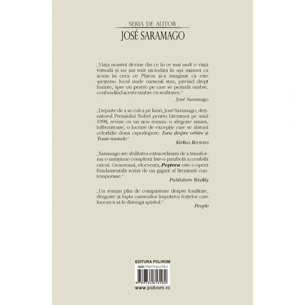 Urmind capodoperelorEseu despre orbiresiToate numele, reeditate de curind in seria de autor dedicata lui Jose Saramago in cadrul colectiei „Biblioteca Polirom”,Pesteraare ca tema opozitia dintre realitatea virtuala, o lume de simulacre creata de societatea postindustriala, si realitatea traditionala a artizanului. O familie de mestesugari, olari din tata-n fiu, traieste si iubeste in umbra Centrului, o constructie tentaculara menita sa le asigure oamenilor fascinati de ea absolut totul, de la produse de consum pina la „senzatii naturale”: muscatura gerului, mingiierea soarelui, ba chiar sentimentul de a se gasi in pestera din mitul platonic, model abreviat al unei lumi in care intoarcem spatele realitatii, privind halucinantele umbre deformate aruncate pe un zid. Ca si in romanele anterioare ale scriitorului portughez, in Pestera se confrunta doua universuri distincte: unul aflat intr-un rapid proces de extinctie si altul care creste si se multiplica asemenea unui joc de oglinzi, confruntare ce reflecta criza sfirsitului de secol si de mileniu.