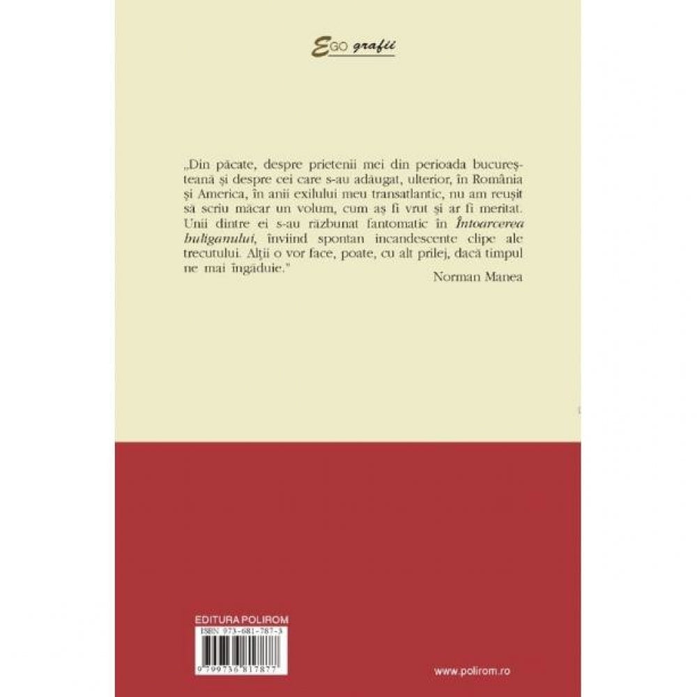 Cu o ampla selectie din articolele publicate de Noman Manea in revistele romanesti, cartea are valoarea unui volum memorialistic. Amintirile marelui scriitor roman care traieste astazi in SUA sint legate de personalitati marcante ale culturii romanesti si universale, precum: Emil Cioran, Nichita Stanescu, Ernesto Sabato, Marin Sorescu, Antonio Tabucchi, Radu Petrescu, Lucian Raicu, Sorin Titel, Z. Ornea, Saul Steinberg etc. Istorisirile, de cele mai multe ori inedite si absolut surprinzatoare, cistiga in autenticitate, capatind chiar valoare de document, prin reproducerile din corespondenta autorului cu personalitatile la care face referire.