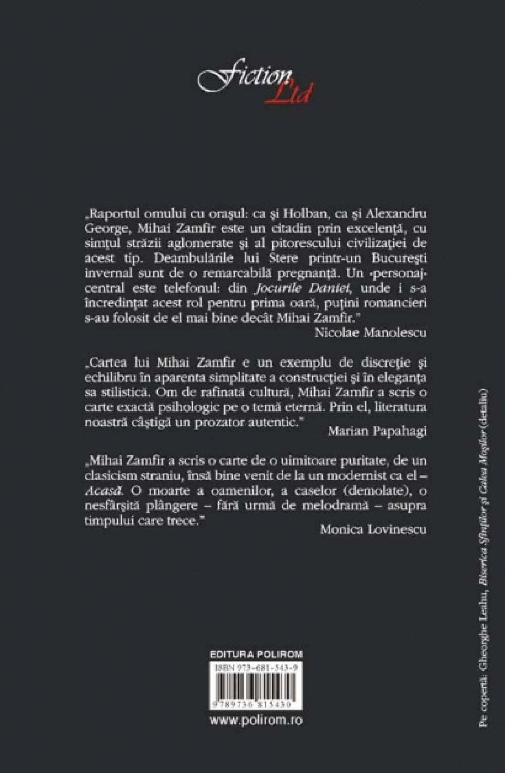 Volumul, care reuneste intr-o a doua editie romanele „Poveste de iarna” si „Acasa”, este unitar prin abordarea specifica romanului interbelic – in ambele naratiuni primeaza povestea, sustinuta insa de o atmosfera extrem de bine conturata. In „Acasa”, firul epic se axeaza pe iubirea familiala, desfasurata intr-un decor al Bucurestilor de altadata si al transformarilor la care orasul este supus in primii ani ai comunismului, in timp ce in „Poveste de iarna” o iubire neimplinita ne aduce in atmosfera sentimentala a unui Bucuresti ceva mai apropiat de zilele noastre. Punctul comun al celor doua romane este insa atragerea cititorilor intr-un univers al sentimentelor redescoperite, in care nu exista alt ghid mai bun decit nostalgia. „Raportul omului cu orasul: ca si Holban, ca si Alexandru George, Mihai Zamfir este un citadin prin excelenta, cu simtul strazii aglomerate si al pitorescului civilizatiei de acest tip. Deambularile lui Stere printr-un Bucuresti invernal sint de o remarcabila pregnanta. Un «personaj» central este telefonul: din «Jocurile Daniei», unde i s-a incredintat acest rol pentru prima oara, putini romancieri s-au folosit de el mai bine decit Mihai Zamfir.” (Nicolae Manolescu)