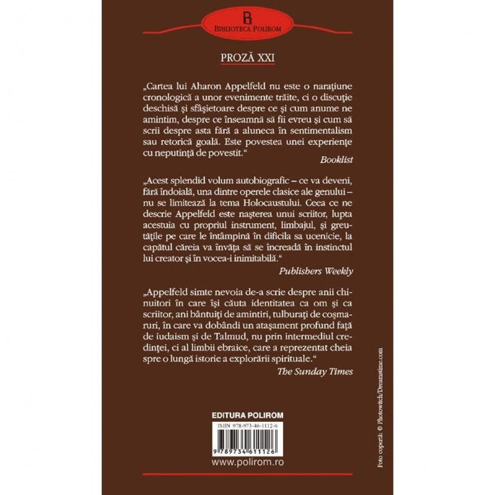 "Cartea lui Aharon Appelfeld nu este o naratiune cronologica a unor evenimente traite, ci o discutie deschisa si sfisietoare despre ce si cum anume ne amintim, despre ce inseamna sa fii evreu si cum sa scrii despre asta fara a aluneca in sentimentalism sau retorica goala. Este povestea unei experiente cu neputinta de povestit." - Booklist