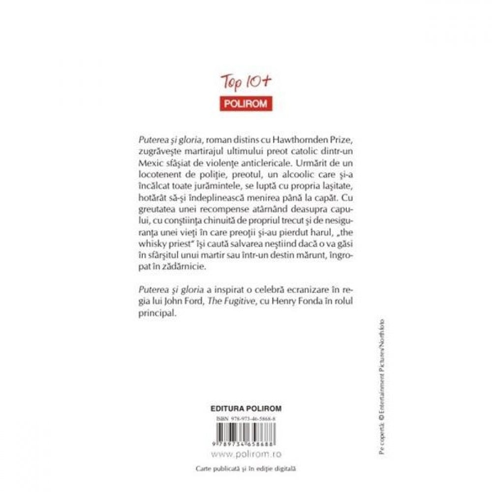 Puterea si gloria, roman distins cu Hawthornden Prize, zugraveste martirajul ultimului preot catolic dintr-un Mexic sfisiat de violente anticlericale. Urmarit de un locotenent de politie, preotul, un alcoolic care si-a incalcat toate juramintele, se lupta cu propria lasitate, hotarit sa-si indeplineasca menirea pina la capat. Cu greutatea unei recompense atirnind deasupra capului, cu constiinta chinuita de propriul trecut si de nesiguranta unei vieti in care preotii si-au pierdut harul, „the whisky priest” isi cauta salvarea nestiind daca o va gasi in sfirsitul unui martir sau intr-un destin marunt, ingropat in zadarnicie.
