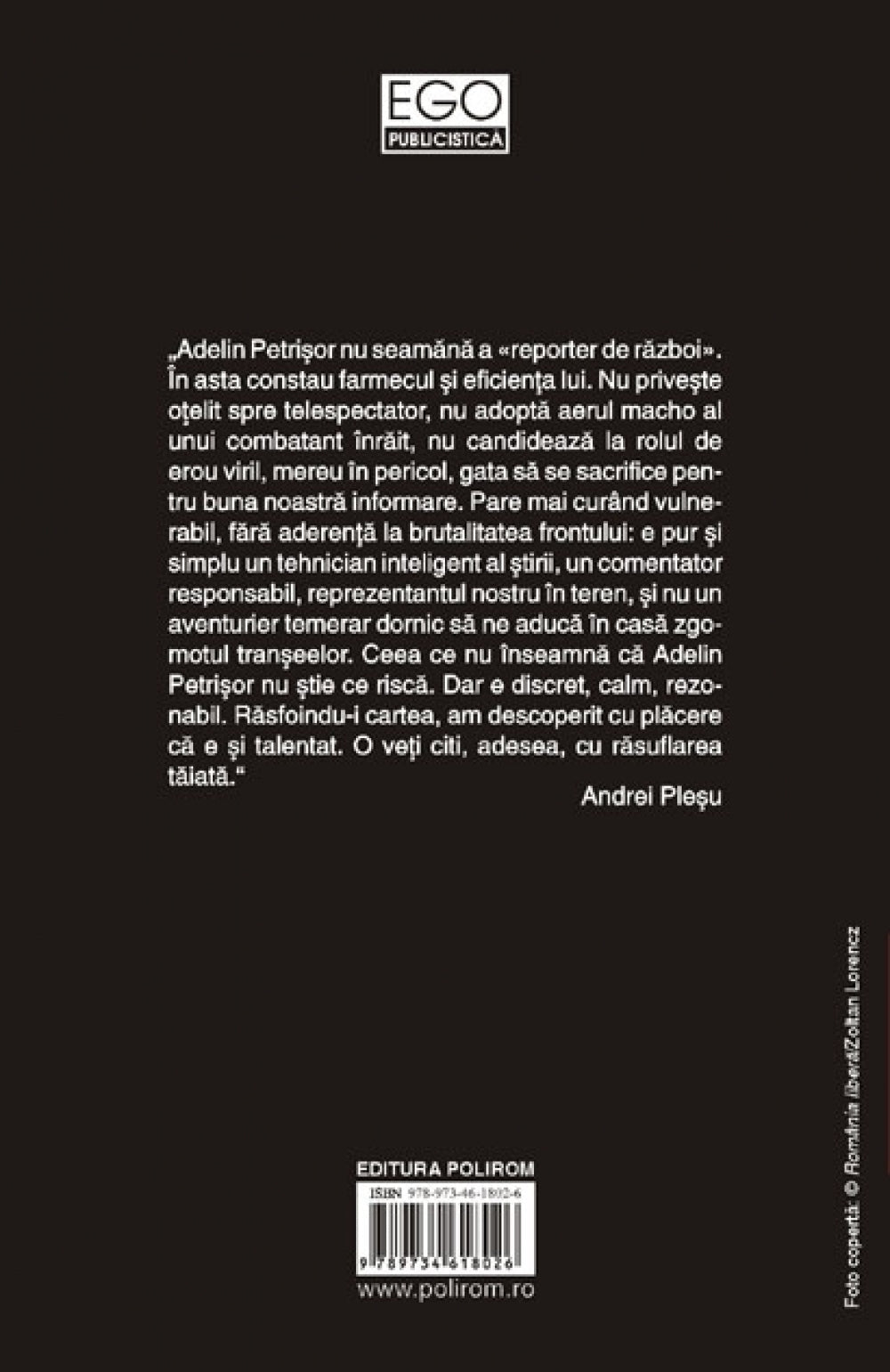 „Adelin Petrisor nu seamana a «reporter de razboi». In asta constau farmecul si eficienta lui. Nu priveste otelit spre telespectator, nu adopta aerul macho al unui combatant inrait, nu candideaza la rolul de erou viril, mereu in pericol, gata sa se sacrifice pentru buna noastra informare. Pare mai curind vulnerabil, fara aderenta la brutalitatea frontului: e pur si simplu un tehnician inteligent al stirii, un comentator responsabil, reprezentantul nostru in teren, si nu un aventurier temerar dornic sa ne aduca in casa zgomotul transeelor. Ceea ce nu inseamna ca Adelin Petrisor nu stie ce risca. Dar e discret, calm, rezonabil. Rasfoindu-i cartea, am descoperit cu placere ca e si talentat. O veti citi, adesea, cu rasuflarea taiata.” (Andrei Plesu)