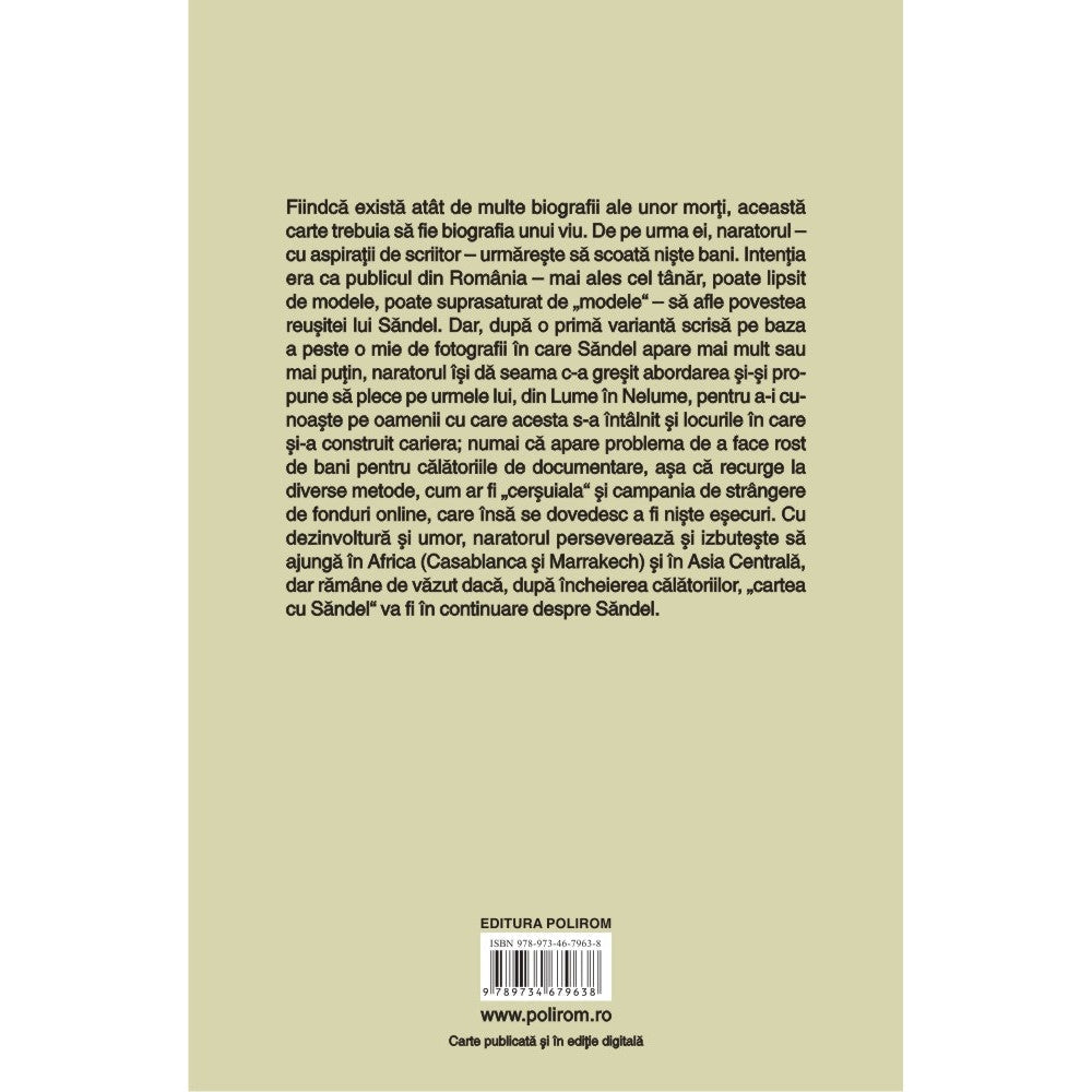 Fiindca exista atit de multe biografii ale unor morti, aceasta carte trebuia sa fie biografia unui viu. De pe urma ei, naratorul – cu aspiratii de scriitor – urmareste sa scoata niste bani. Intentia era ca publicul din Romania – mai ales cel tinar, poate lipsit de modele, poate suprasaturat de „modele” – sa afle povestea reusitei lui Sandel. Dar, dupa o prima varianta scrisa pe baza a peste o mie de fotografii in care Sandel apare mai mult sau mai putin, naratorul isi da seama c-a gresit abordarea si-si propune sa plece pe urmele lui, din Lume in Nelume, pentru a-i cunoaste pe oamenii cu care acesta s-a intilnit si locurile in care si-a construit cariera; numai ca apare problema de a face rost de bani pentru calatoriile de documentare, asa ca recurge la diverse metode, cum ar fi „cersuiala” si campania de stringere de fonduri online, care insa se dovedesc a fi niste esecuri. Cu dezinvoltura si umor, naratorul persevereaza si izbuteste sa ajunga in Africa (Casablanca si Marrakech) si in Asia Centrala, dar ramine de vazut daca, dupa incheierea calatoriilor, „cartea cu Sandel” va fi in continuare despre Sandel.
