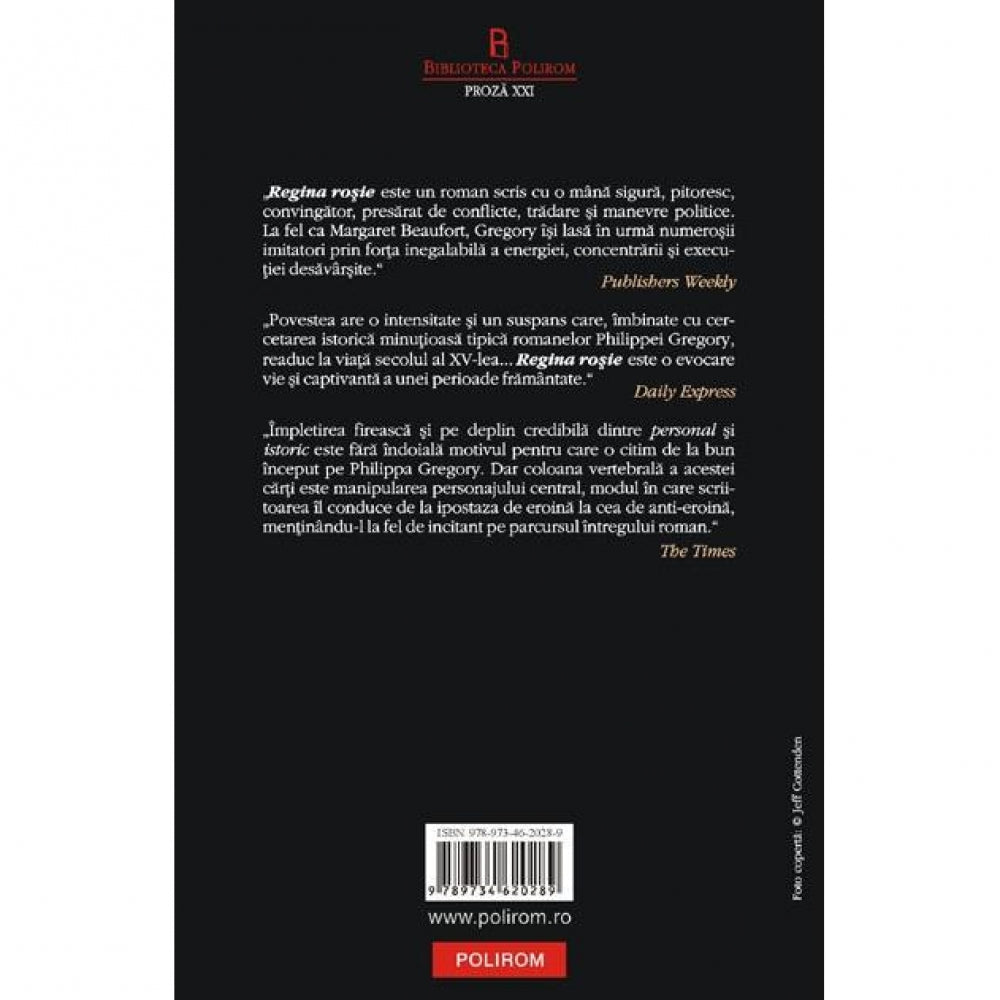 Regina rosie (2010), al doilea roman din ciclul dedicat Razboiului celor Doua Roze, imbogateste galeria de femei puternice si influente creata de Philippa Gregory cu o figura emblematica pentru istoria Angliei: lady Margaret Beaufort, femeia ale carei ambitie, inteligenta si curaj au dus la intemeierea dinastiei Tudor. Romanul urmareste cu fidelitate destinul ei schimbator si transformarea sa uluitoare dintr-o tinara inocenta si pioasa de noua ani, silita sa se supuna fara proteste dorintelor familiei pentru a incheia o casatorie lipsita de iubire, intr-o curteana abila si hotarita. Ea nu se da in laturi de la cele mai primejdioase uneltiri, de la cele mai indoielnice aliante sau cele mai avantajoase casatorii pentru a-si vedea implinit visul cel mai fierbinte: acela de a-si vedea fiul pe tronul Angliei. Philippa Gregory zugraveste in culori vii perioada adolescentei si maturitatii sale intr-o Anglie sfisiata de rivalitatile dintre Casa de Lancaster si Casa de York si devastata de bataliile singeroase din Razboiul celor Doua Roze.