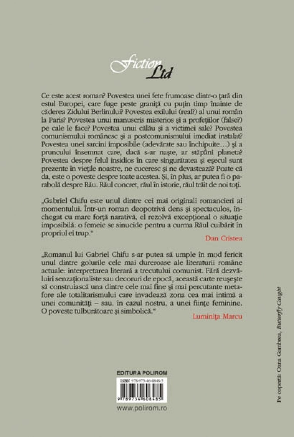 „Gabriel Chifu este unul dintre cei mai originali romancieri ai momentului. Intr-un roman deopotriva dens si spectaculos, inchegat cu mare forta narativa, el rezolva exceptional o situatie imposibila: o femeie se sinucide pentru a curma Raul cuibarit in propriul ei trup.” (Dan Cristea)