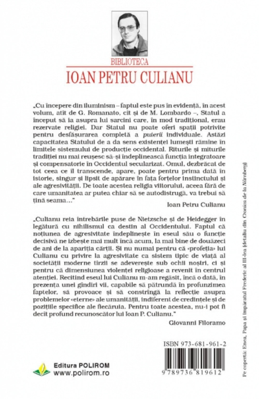 Lucrarea de fata cuprinde versiunile romanesti a trei studii: La Chiesa e lo Stato laico de G. Romanato, Per una economia politica dei beni religiosi de M.G. Lombardo si Religione e accrescimento del potere de I.P. Culianu (text care continua linia unei cercetari incepute deja prin „La religione come strumento del potere e mezzo di liberazione in ambito non cristiano”, Verifiche, 4, 1975, pp. 236-255). Impreuna, ele au alcatuit volumul Religione e potere, aparut in Italia, la Editura Marietti – Torino (1981), in colectia Chiesa sotto inchiesta, consacrata istoriei ecleziastice si dirijata de scriitorul si eseistul Franco Molinari. Volumul Religie si putere formeaza in mare masura un tot unitar, cele trei studii fiind in multe privinte complementare (in ciuda diferentelor de perspectiva teoretica si de metodologie evidentiate de autori – sau poate tocmai datorita lor). In orice caz, astfel l-au receptat publicul si presa italiana, in care ecourile lucrarii au fost insemnate si au persistat multi ani dupa aparitia ei.