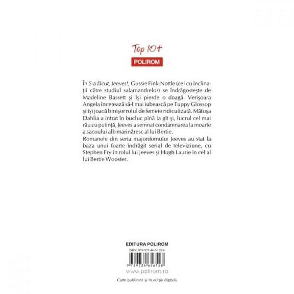 In S-a facut, Jeeves!, Gussie Fink-Nottle (cel cu inclinatii catre studiul salamandrelor) se indragosteste de Madeline Bassett si isi pierde o doaga. Verisoara Angela inceteaza sa-l mai iubeasca pe Tuppy Glossop si isi joaca binisor rolul de femeie ridiculizata. Matusa Dahlia a intrat in bucluc pina la git si, lucrul cel mai rau cu putinta, Jeeves a semnat condamnarea la moarte a sacoului alb marinaresc al lui Bertie.