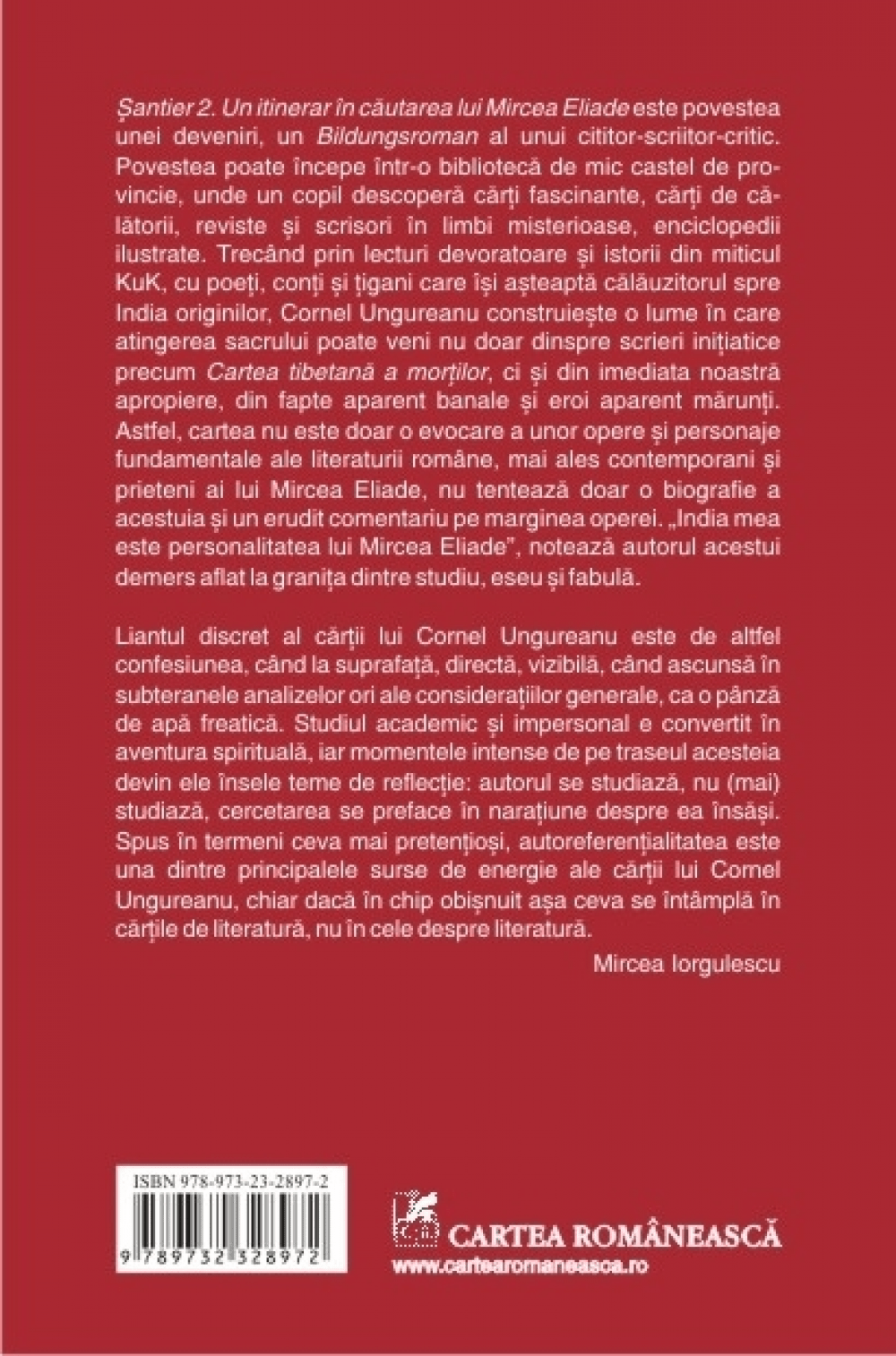 Liantul discret al cartii lui Cornel Ungureanu este de altfel confesiunea, cind la suprafata, directa, vizibila, cind ascunsa in subteranele analizelor ori ale consideratiilor generale ca o pinza de apa freatica. Studiul academic si impersonal e convertit in aventura spirituala, iar momentele intense de pe traseul acesteia devin ele insele teme de reflectie: autorul se studiaza, nu (mai) studiaza, cercetarea se preface in naratiune despre ea insasi. Spus in termeni ceva mai pretentiosi, autoreferentialitatea este una dintre principalele surse de energie ale cartii lui Cornel Ungureanu, chiar daca in chip obisnuit asa ceva se intimpla in cartile de literatura, nu in cele despre literatura.